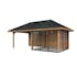 Tillverkad av nordisk gran med 120x120 mm starka limträstolpar och 19 mm takbrädor. Låsbara skjutdörrarna i 24 mm härdat dubbelglas (4 mm härdat glas - 16 mm luftspalt - 4 mm härdat glas) monterat i solida aluminiumprofiler. 28 mm väggstockar.