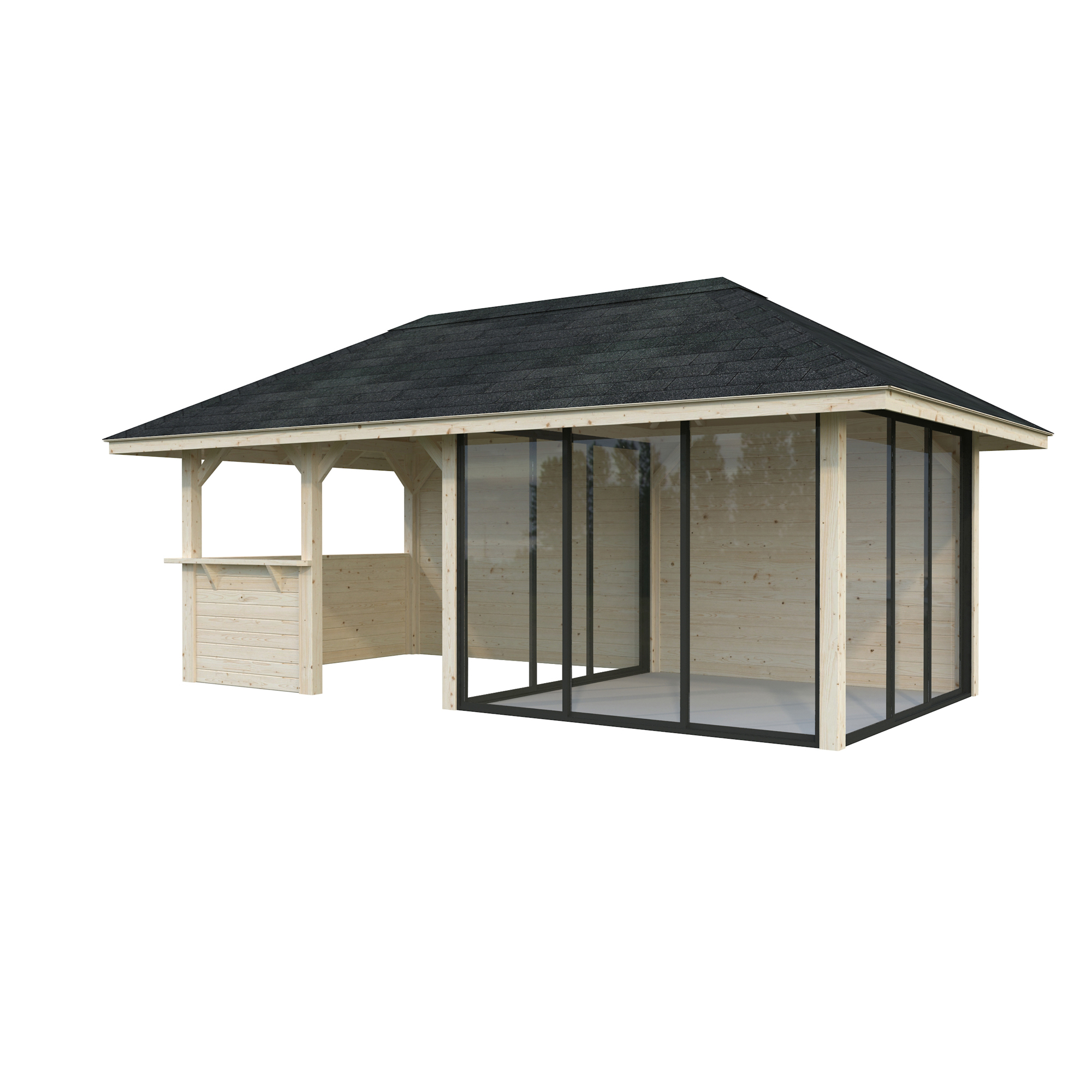 Tillverkad av nordisk gran med 120x120 mm starka limträstolpar och 19 mm takbrädor. Låsbara skjutdörrarna i 24 mm härdat dubbelglas (4 mm härdat glas - 16 mm luftspalt - 4 mm härdat glas) monterat i solida aluminiumprofiler. 28 mm väggstockar.