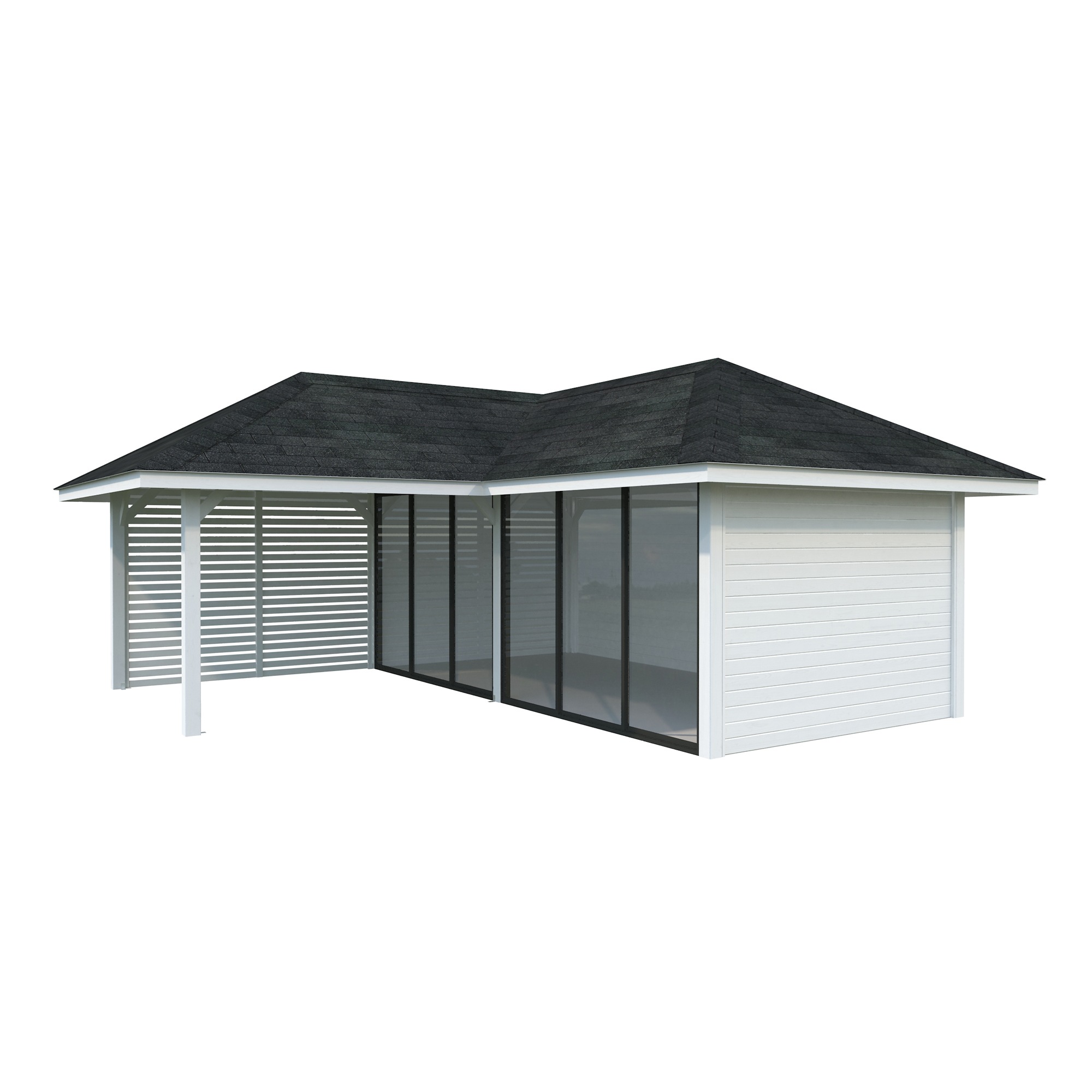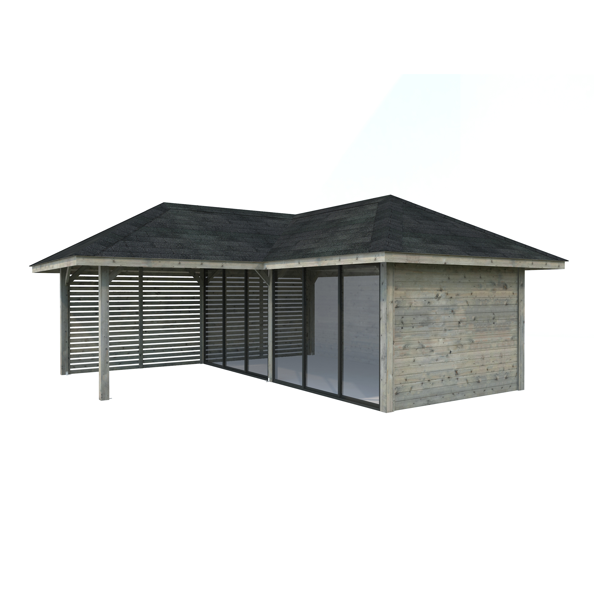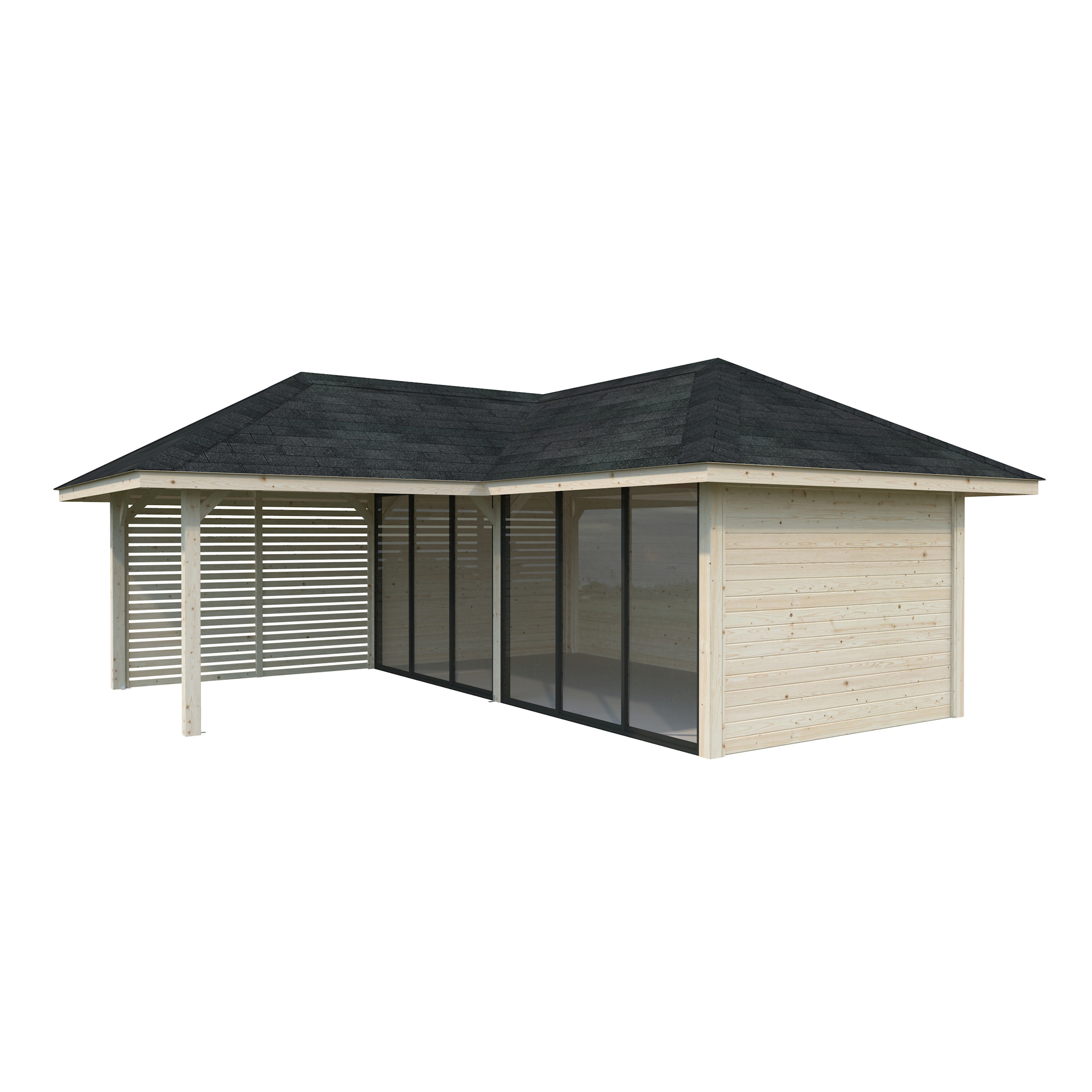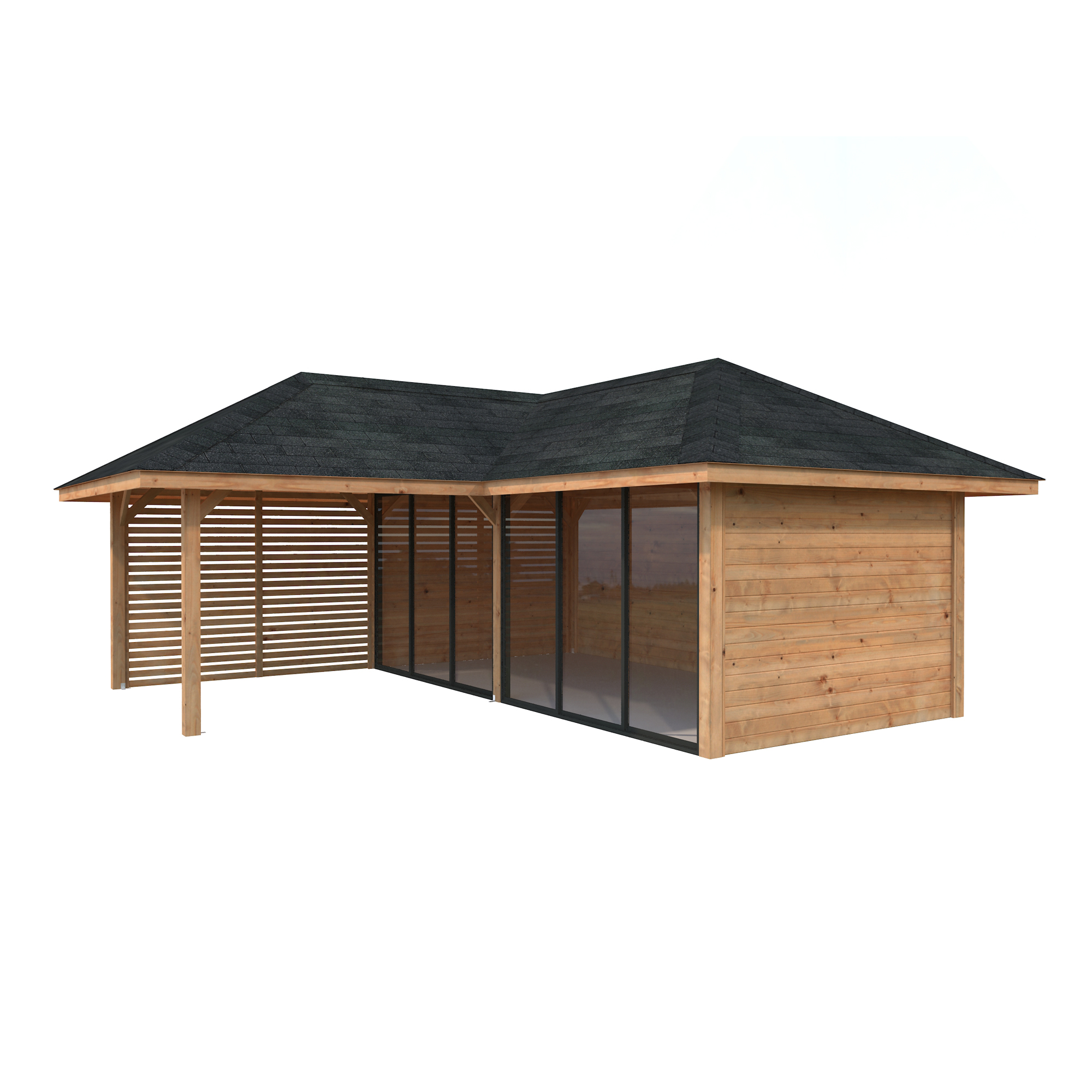 Tillverkad av nordisk gran med 120x120 mm starka limträstolpar och 19 mm takbrädor. Låsbara skjutdörrarna i 24 mm härdat dubbelglas (4 mm härdat glas - 16 mm luftspalt - 4 mm härdat glas) monterat i solida aluminiumprofiler. 28 mm väggstockar.