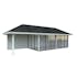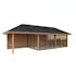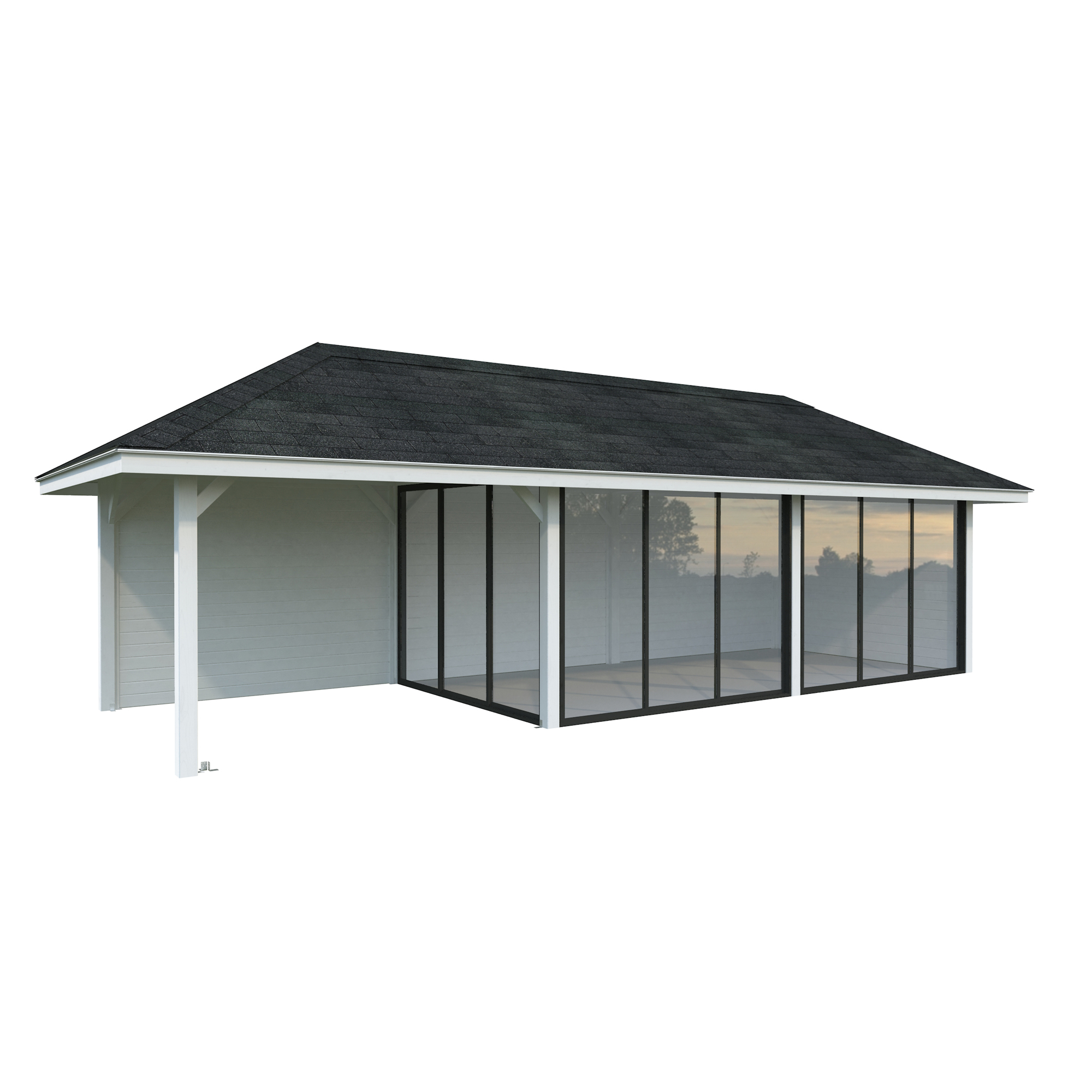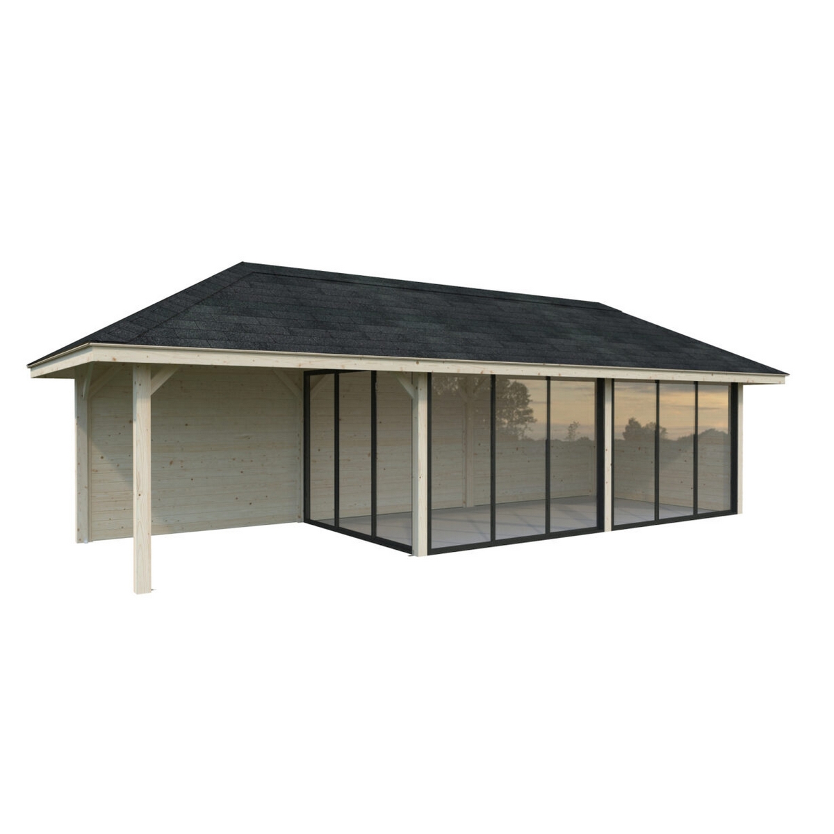 Tillverkad av nordisk gran med 120x120 mm starka limträstolpar och 19 mm takbrädor. Låsbara skjutdörrarna i 4 mm härdat glas och aluminium. 28 mm väggstockar.