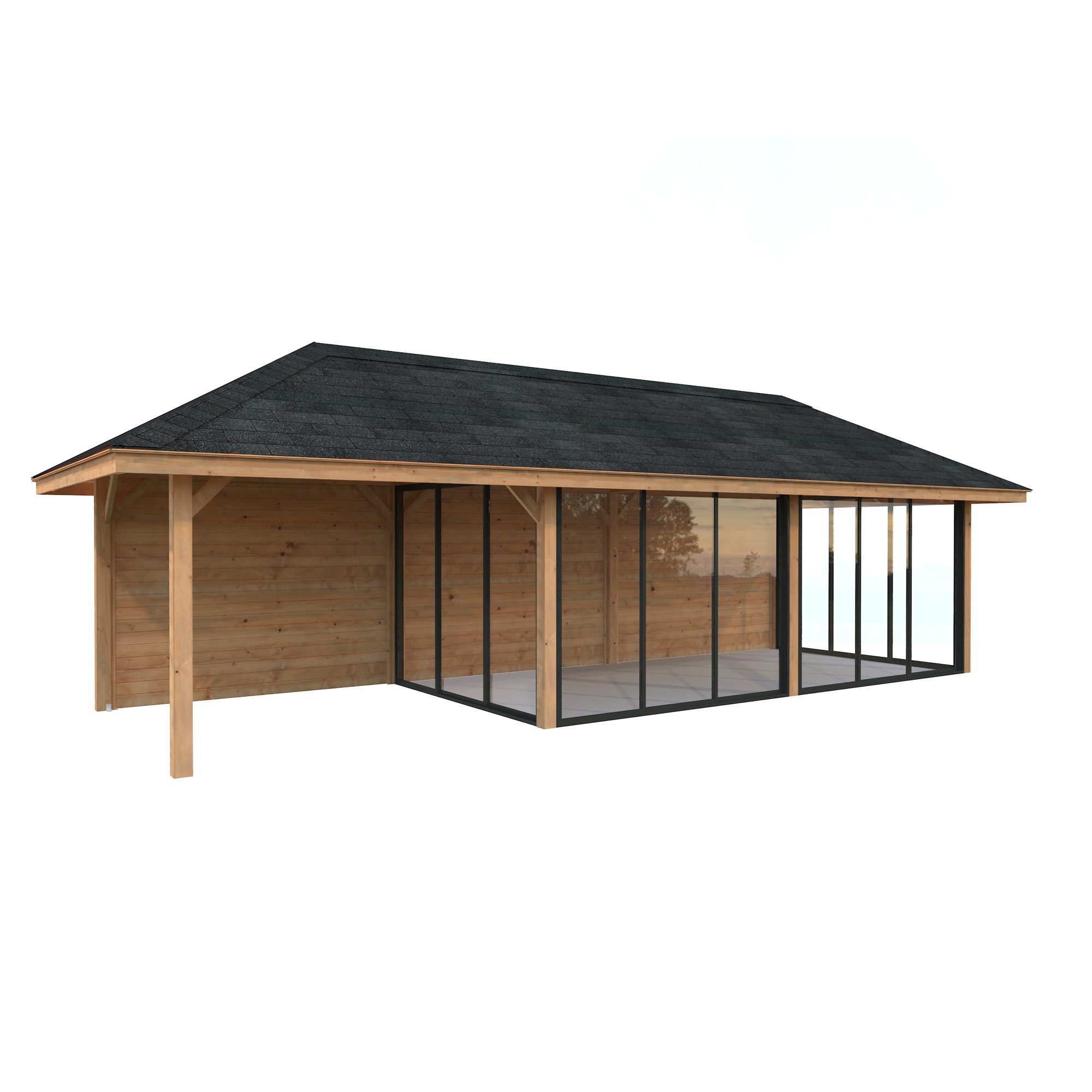 Tillverkad av nordisk gran med 120x120 mm starka limträstolpar och 19 mm takbrädor. Låsbara skjutdörrarna i 4 mm härdat glas och aluminium. 28 mm väggstockar.