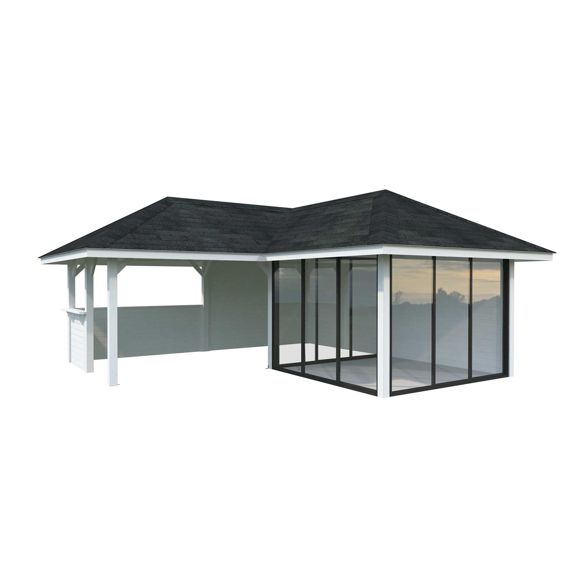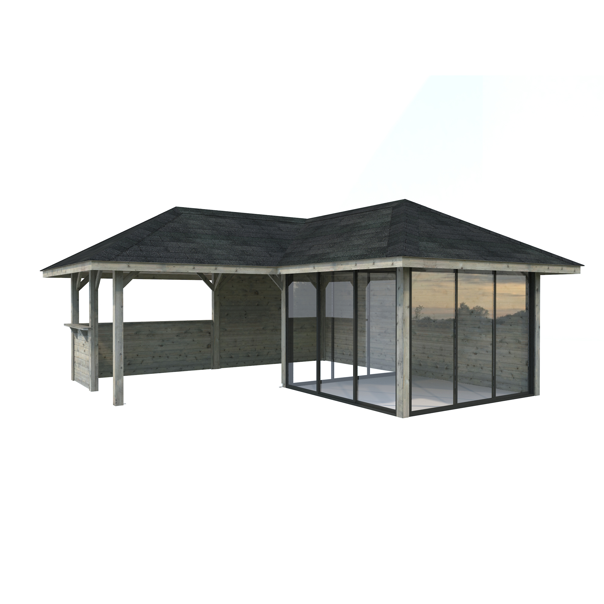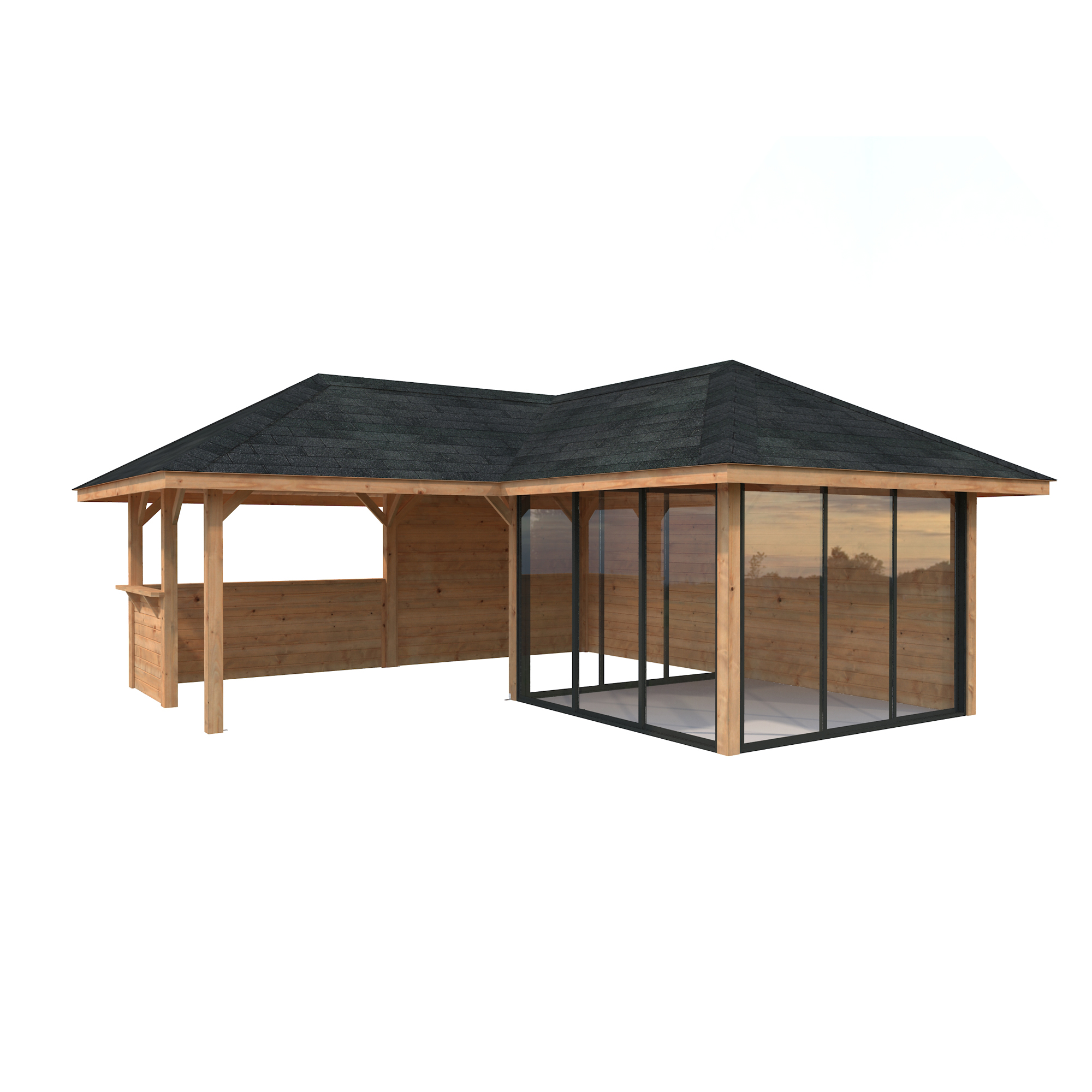 Tillverkad av nordisk gran med 120x120 mm starka limträstolpar och 19 mm takbrädor. Låsbara skjutdörrarna i 24 mm härdat dubbelglas (4 mm härdat glas - 16 mm luftspalt - 4 mm härdat glas) monterat i solida aluminiumprofiler. 28 mm väggstockar.
