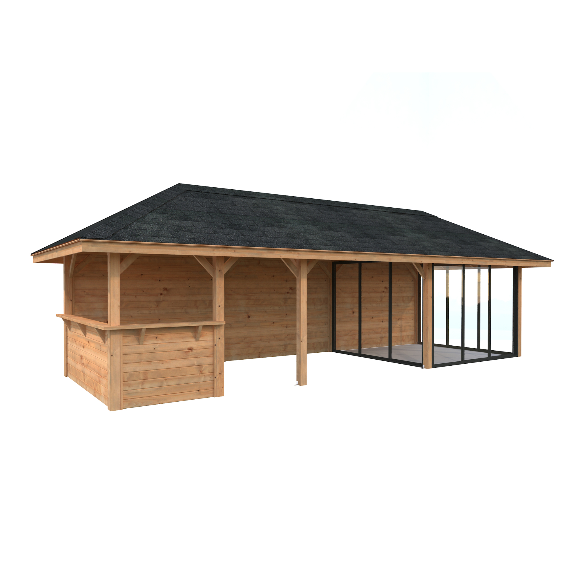 Tillverkad av nordisk gran med 120x120 mm starka limträstolpar och 19 mm takbrädor. Låsbara skjutdörrarna i 24 mm härdat dubbelglas (4 mm härdat glas - 16 mm luftspalt - 4 mm härdat glas) monterat i solida aluminiumprofiler. 28 mm väggstockar.