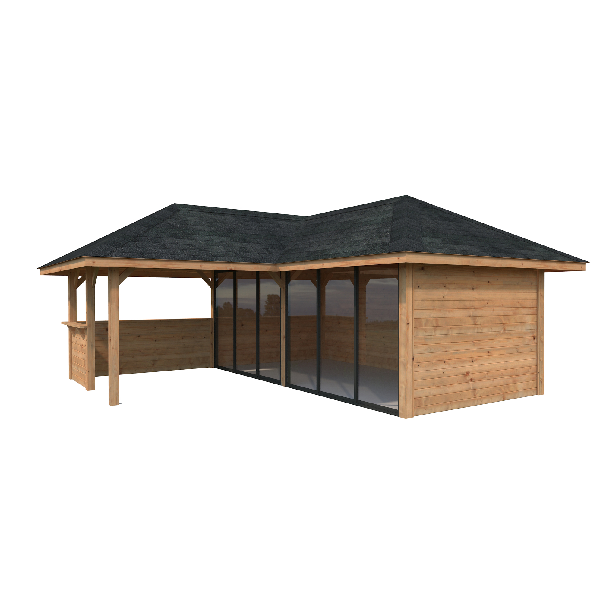 Tillverkad av nordisk gran med 120x120 mm starka limträstolpar och 19 mm takbrädor. Låsbara skjutdörrarna i 24 mm härdat dubbelglas (4 mm härdat glas - 16 mm luftspalt - 4 mm härdat glas) monterat i solida aluminiumprofiler. 28 mm väggstockar.