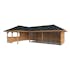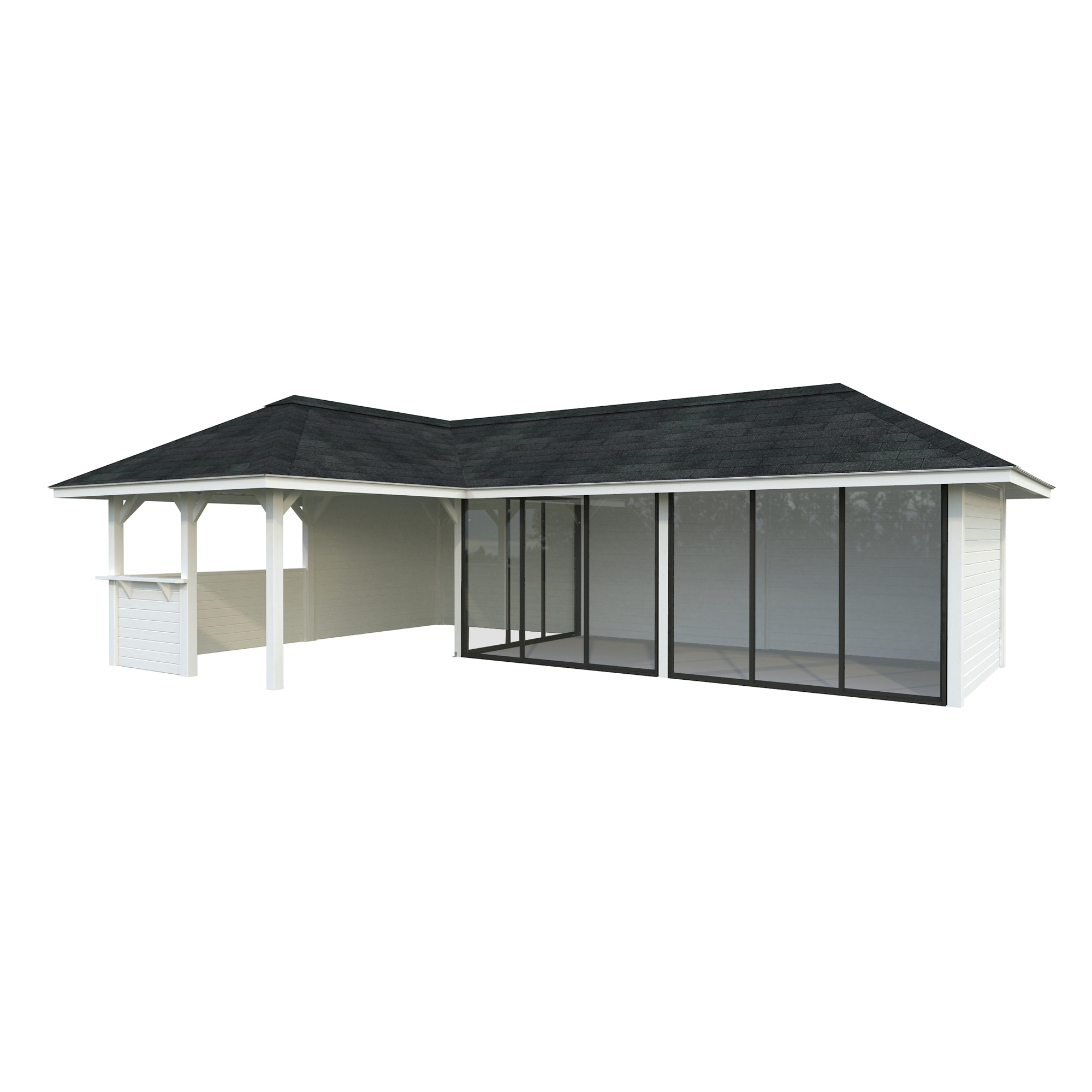 Tillverkad av nordisk gran med 120x120 mm starka limträstolpar och 19 mm takbrädor. Låsbara skjutdörrarna i 4 mm härdat glas och aluminium. 28 mm väggstockar.