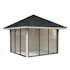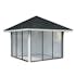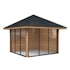 Tillverkad av nordisk gran med 120x120 mm starka limträstolpar och 19 mm takbrädor. Låsbara skjutdörrarna i 4 mm härdat glas och aluminium. 28 mm väggstockar.