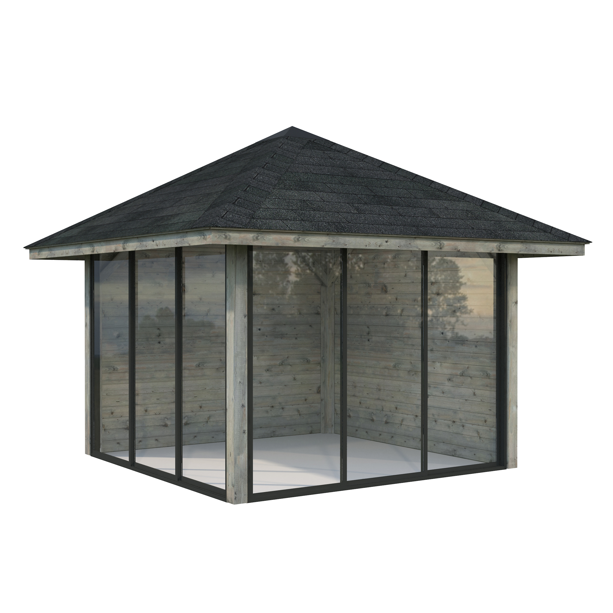 Tillverkad av nordisk gran med 120x120 mm starka limträstolpar och 19 mm takbrädor. Låsbara skjutdörrarna i 24 mm härdat dubbelglas (4 mm härdat glas - 16 mm luftspalt - 4 mm härdat glas) monterat i solida aluminiumprofiler. 28 mm väggstockar.