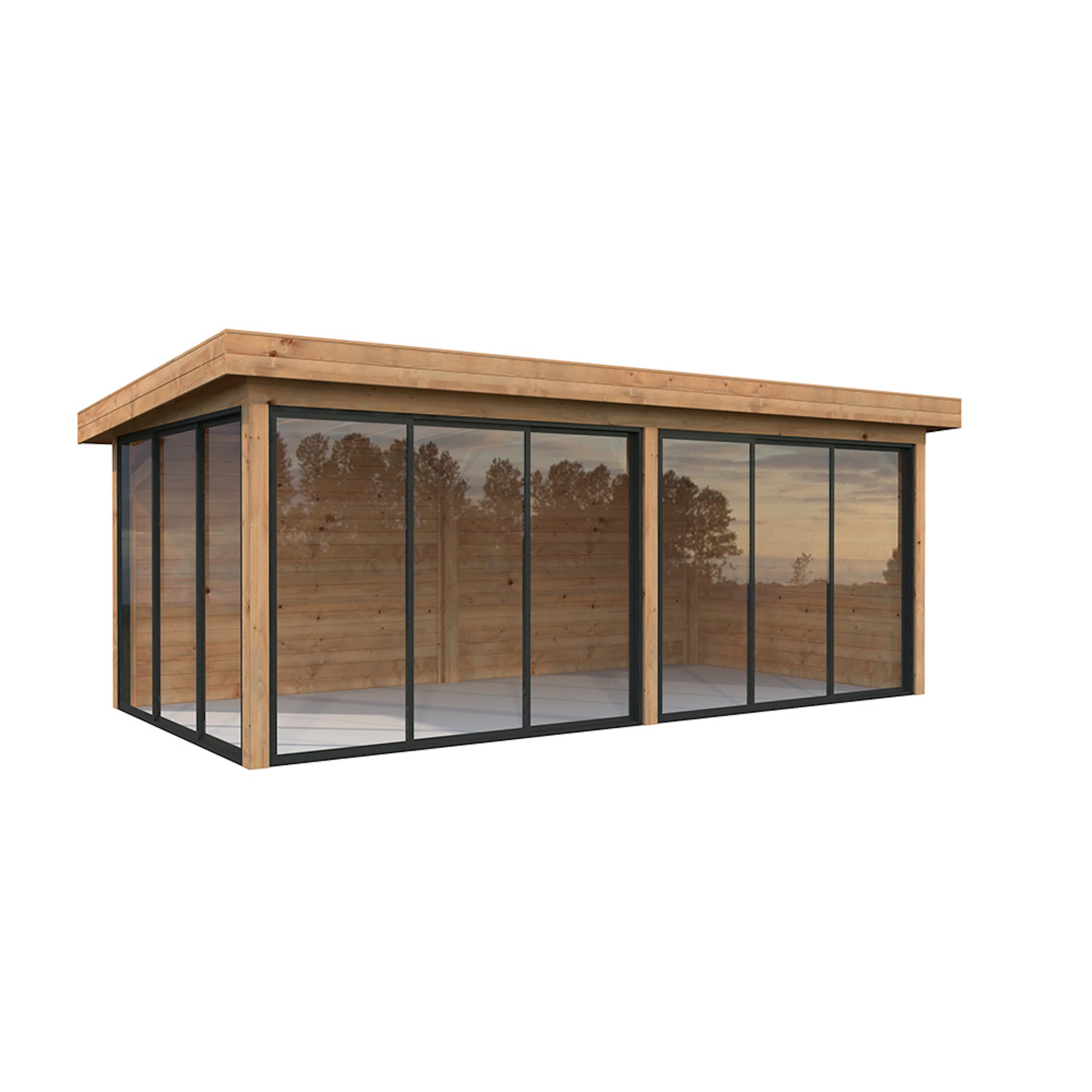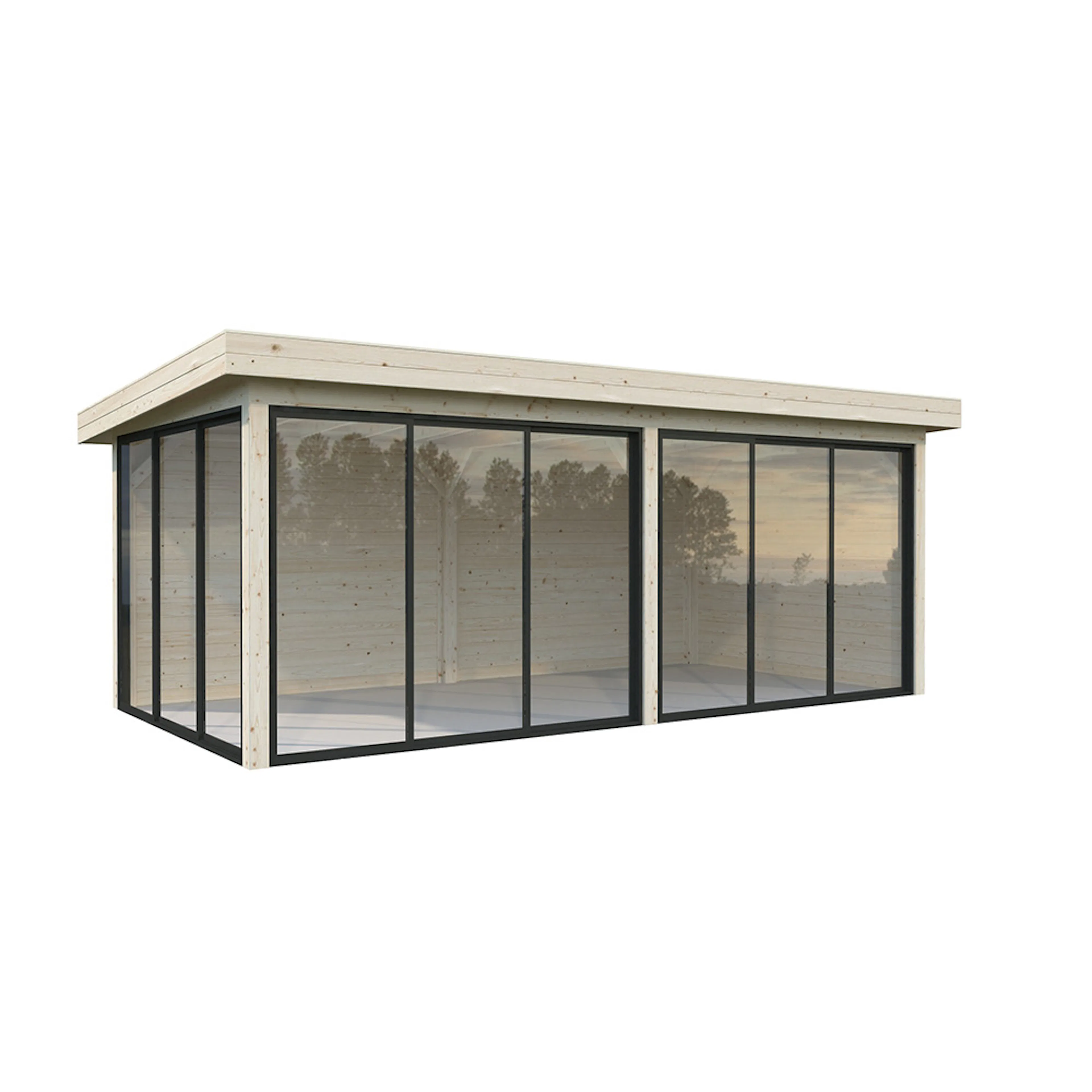 Tillverkad av nordisk gran med 120x120 mm starka limträstolpar och 19 mm takbrädor. Låsbara skjutdörrarna i 4 mm härdat glas och aluminium. 28 mm väggstockar.