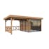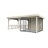 Tillverkad av nordisk gran med 120x120 mm starka limträstolpar och 19 mm takbrädor. Låsbara skjutdörrarna i 4 mm härdat glas och aluminium. 28 mm väggstockar.