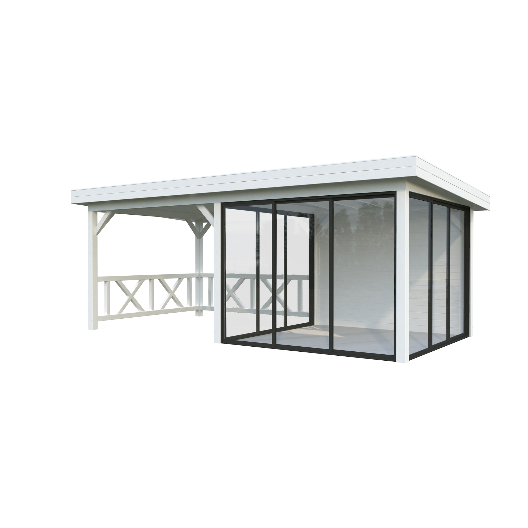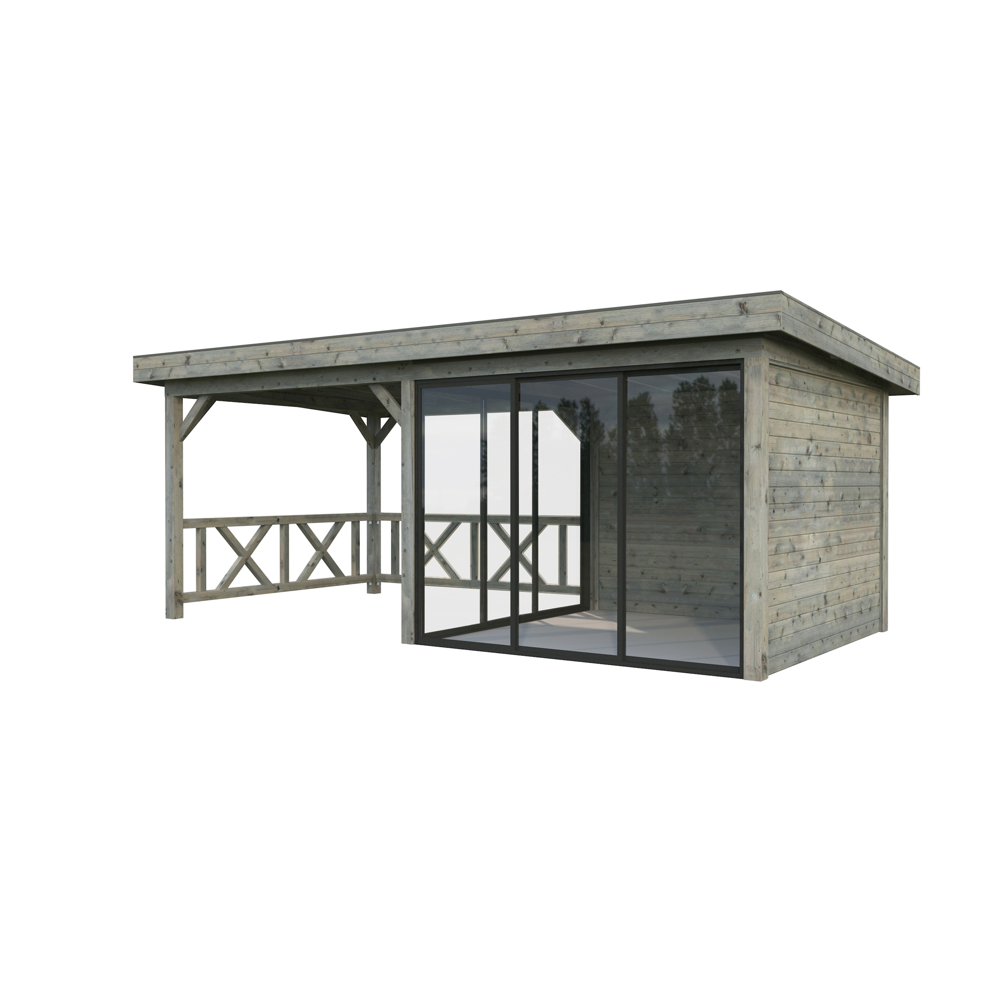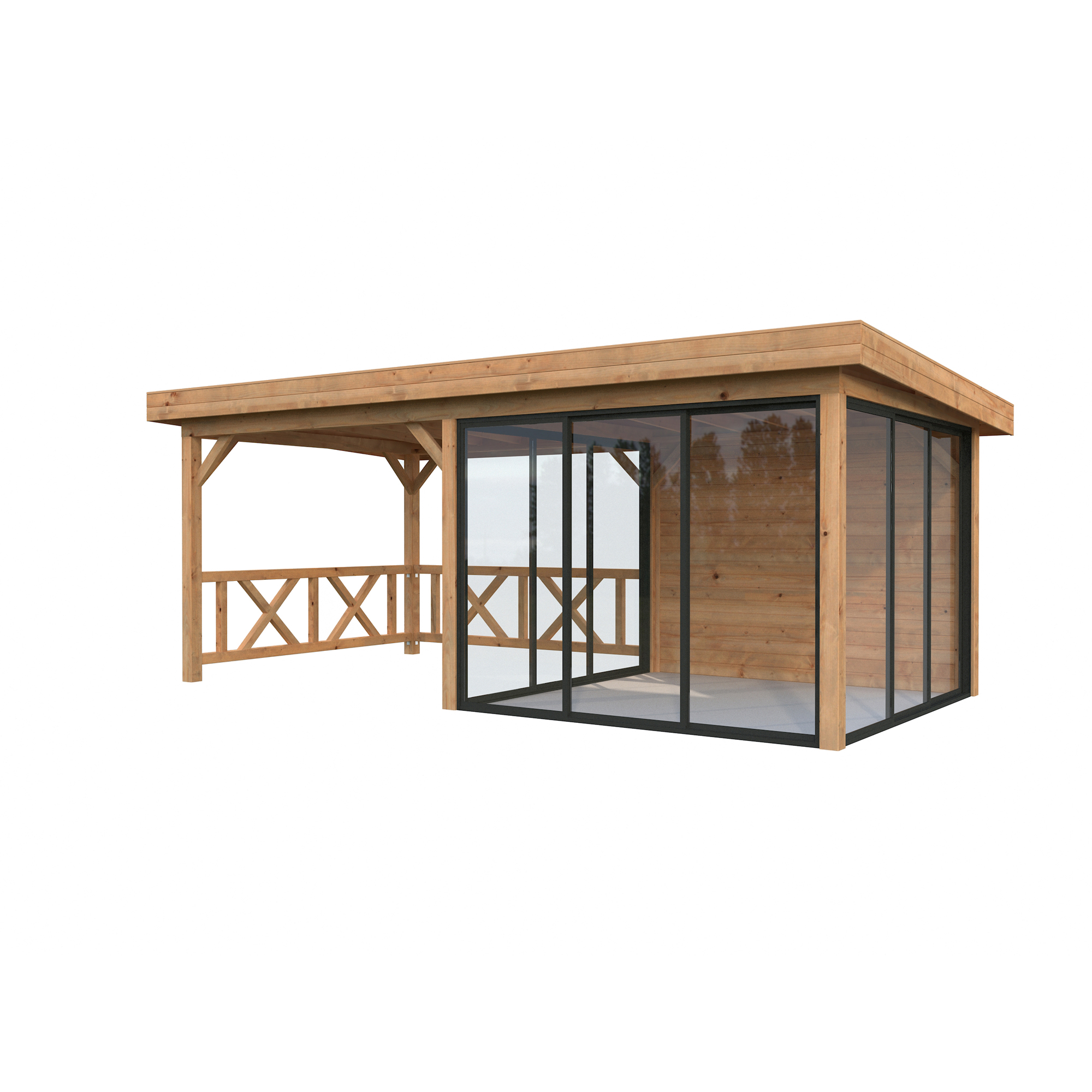 Tillverkad av nordisk gran med 120x120 mm starka limträstolpar och 19 mm takbrädor. Låsbara skjutdörrarna i 24 mm härdat dubbelglas (4 mm härdat glas - 16 mm luftspalt - 4 mm härdat glas) monterat i solida aluminiumprofiler. 28 mm väggstockar.