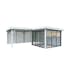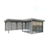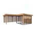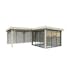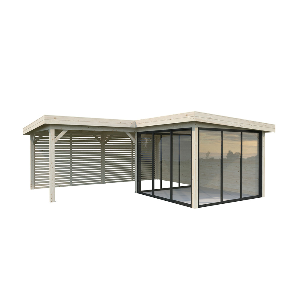 Tillverkad av nordisk gran med 120x120 mm starka limträstolpar och 19 mm takbrädor. Låsbara skjutdörrarna i 4 mm härdat glas och aluminium. 28 mm väggstockar. Rymligt skydd under tak och jalusiväggar.