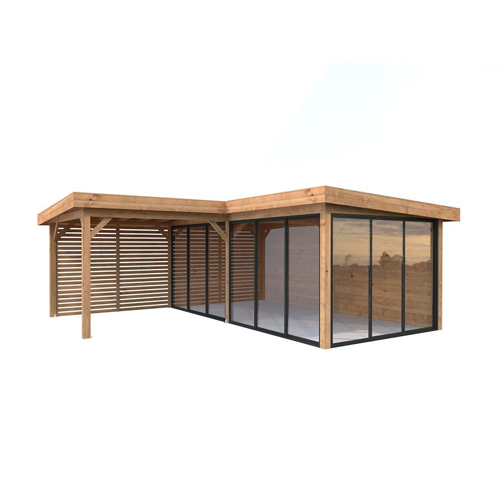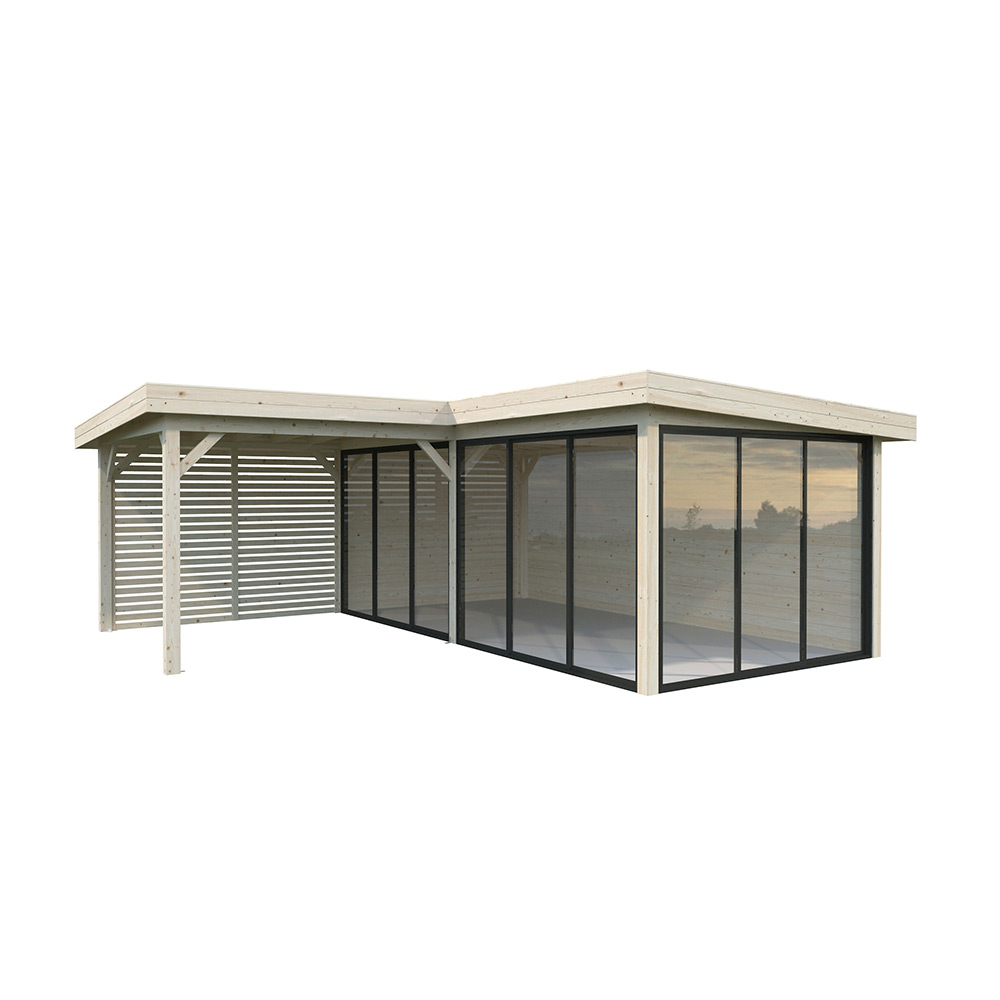Tillverkad av nordisk gran med 120x120 mm starka limträstolpar och 19 mm takbrädor. Låsbara skjutdörrarna i 4 mm härdat glas och aluminium. 28 mm väggstockar. Jalusivägg.