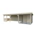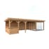 Tillverkad av nordisk gran med 120x120 mm starka limträstolpar och 19 mm takbrädor. Låsbara skjutdörrarna i 4 mm härdat glas och aluminium. 28 mm väggstockar. Rymligt skydd under tak och jalusiväggar.
