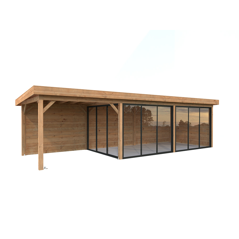 Tillverkad av nordisk gran med 120x120 mm starka limträstolpar och 19 mm takbrädor. Låsbara skjutdörrarna i 4 mm härdat glas och aluminium. 28 mm väggstockar.