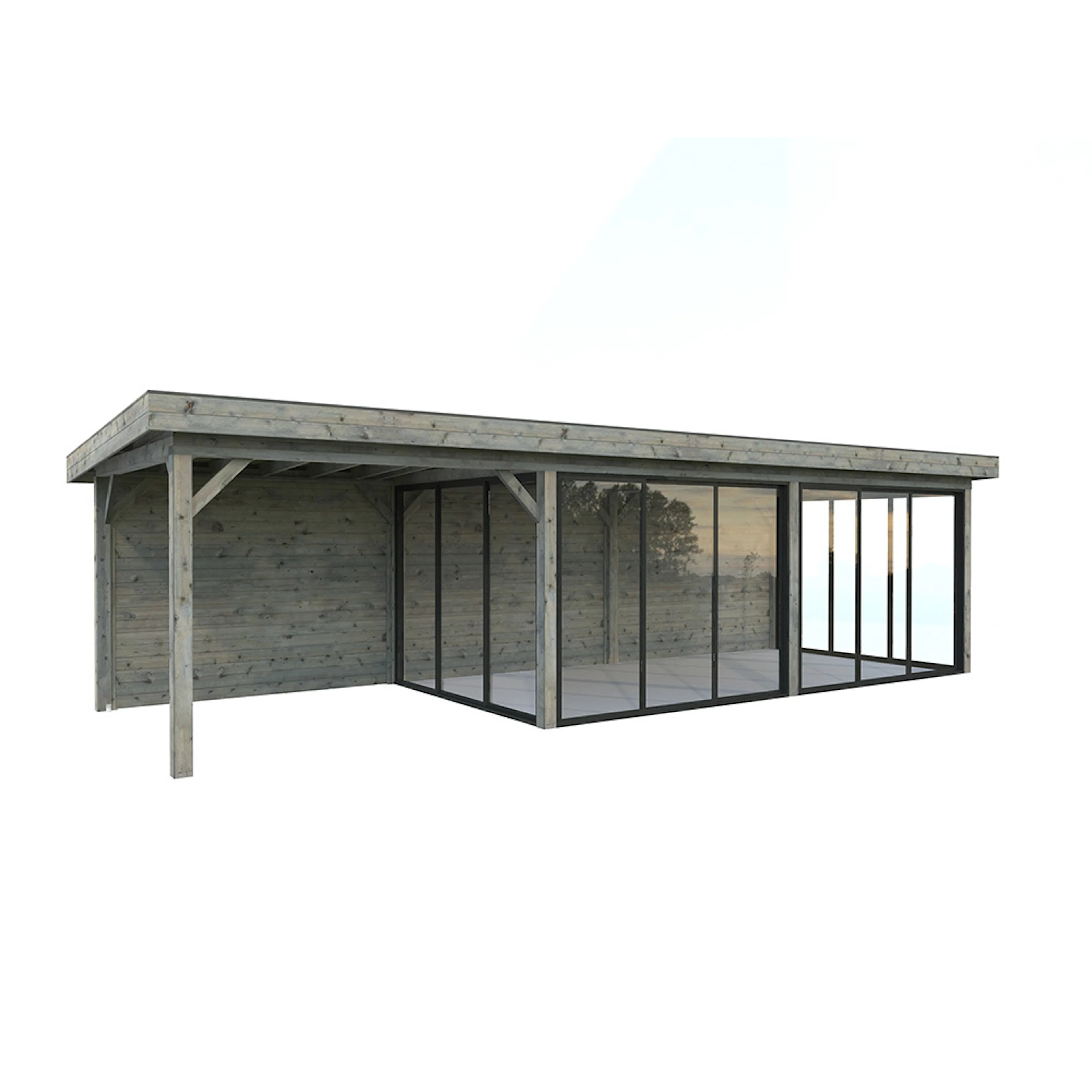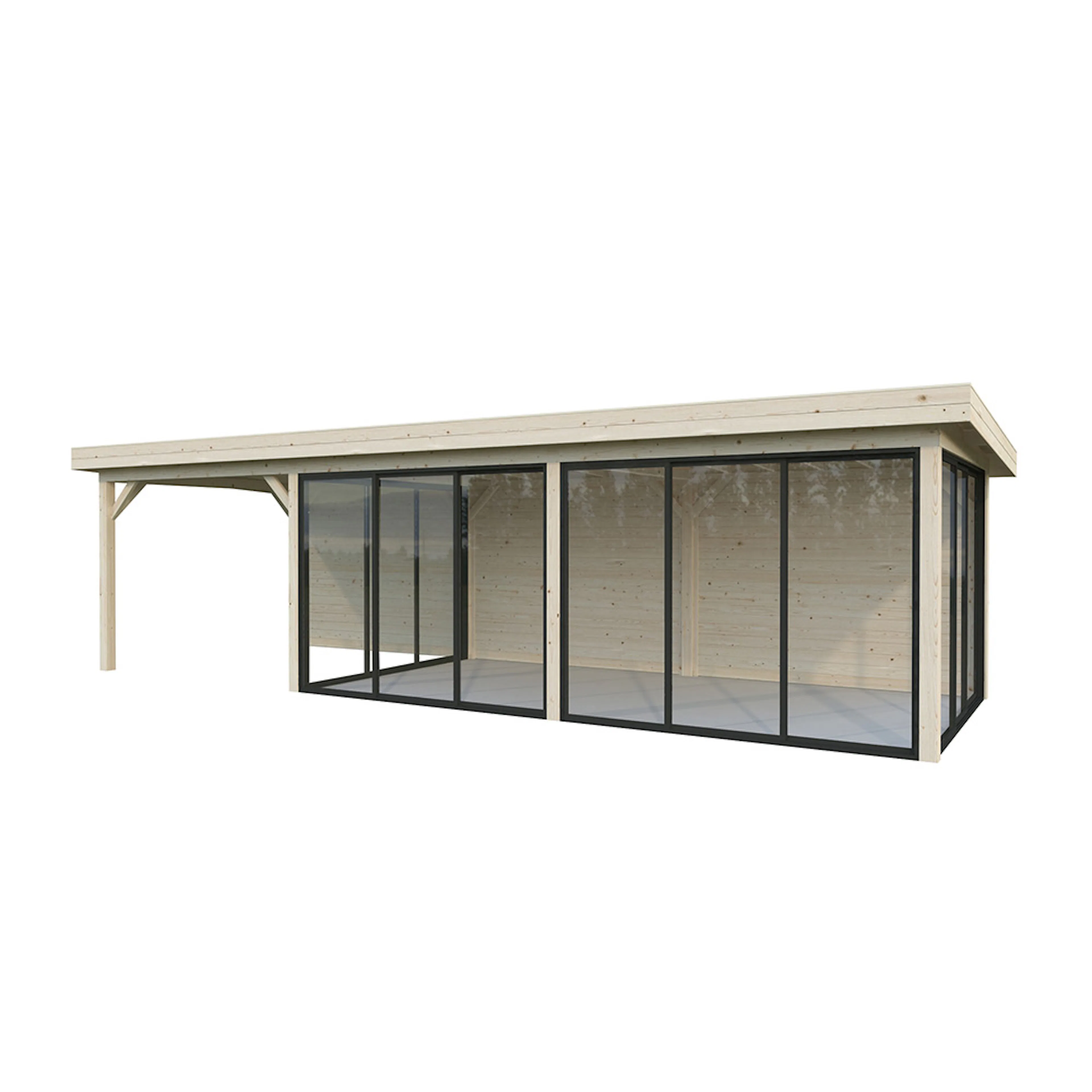 Tillverkad av nordisk gran med 120x120 mm starka limträstolpar och 19 mm takbrädor. Låsbara skjutdörrarna i 4 mm härdat glas och aluminium. 28 mm väggstockar.