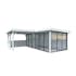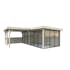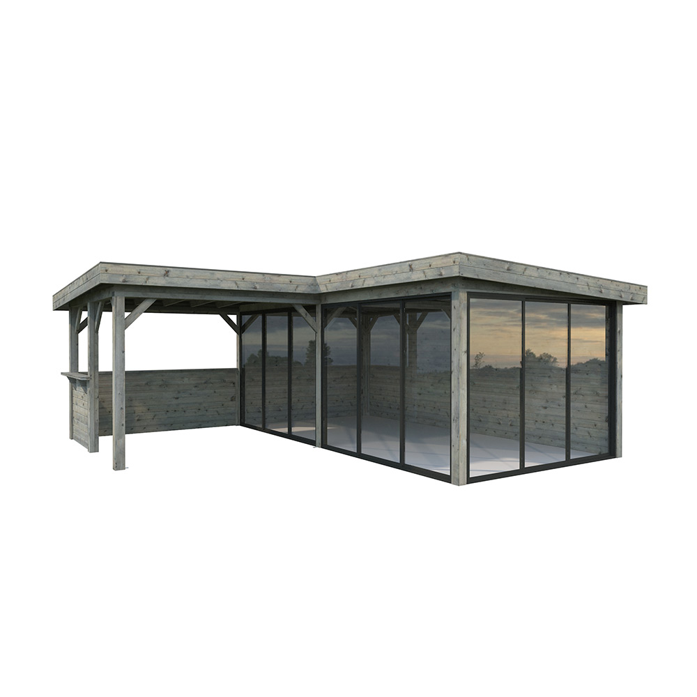 Tillverkad av nordisk gran med 120x120 mm starka limträstolpar och 19 mm takbrädor. Låsbara skjutdörrarna i 4 mm härdat glas och aluminium. 28 mm väggstockar.