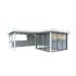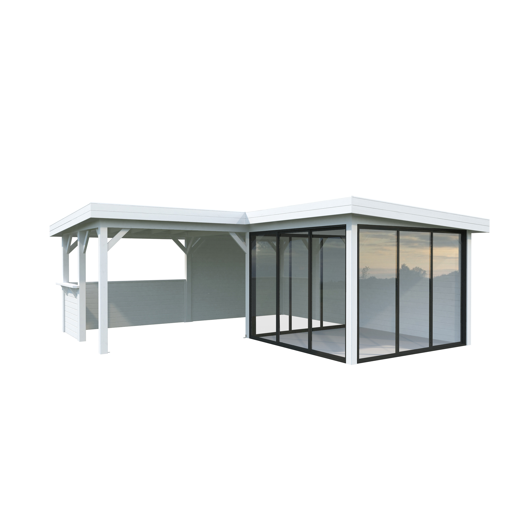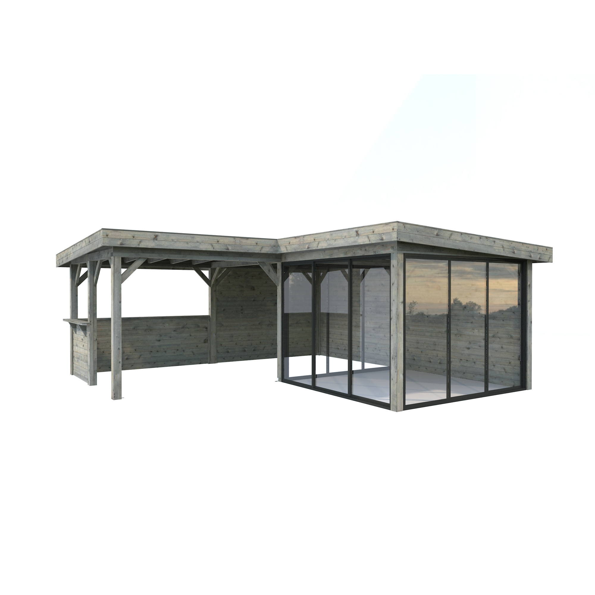 Tillverkad av nordisk gran med 120x120 mm starka limträstolpar och 19 mm takbrädor. Låsbara skjutdörrarna i 24 mm härdat dubbelglas (4 mm härdat glas - 16 mm luftspalt - 4 mm härdat glas) monterat i solida aluminiumprofiler. 28 mm väggstockar.