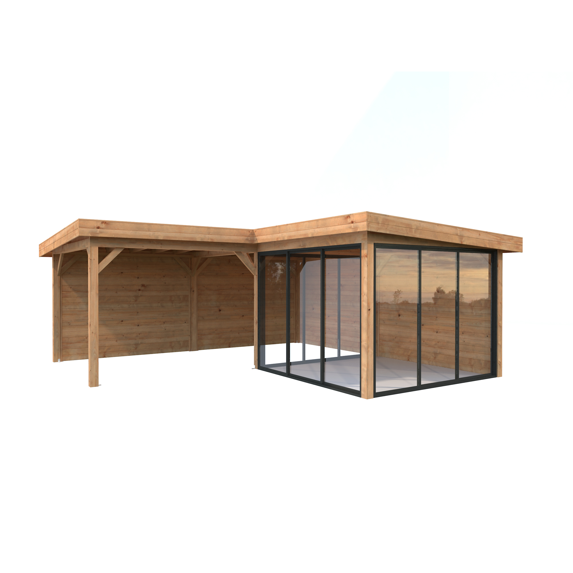 Tillverkad av nordisk gran med 120x120 mm starka limträstolpar och 19 mm takbrädor. Låsbara skjutdörrarna i 24 mm härdat dubbelglas (4 mm härdat glas - 16 mm luftspalt - 4 mm härdat glas) monterat i solida aluminiumprofiler. 28 mm väggstockar.