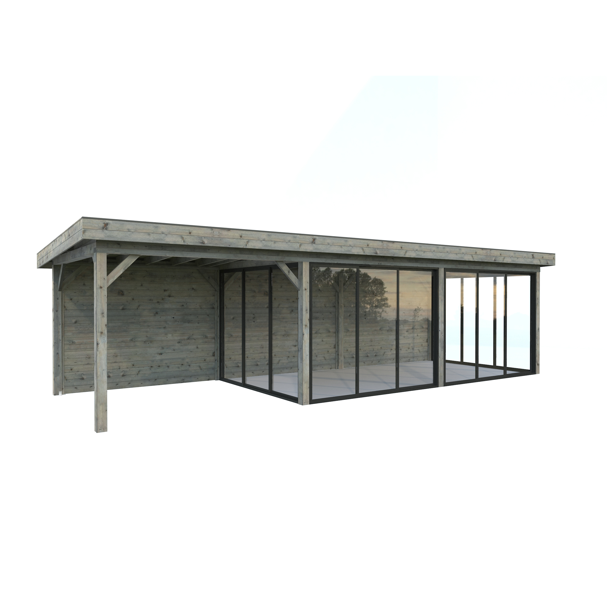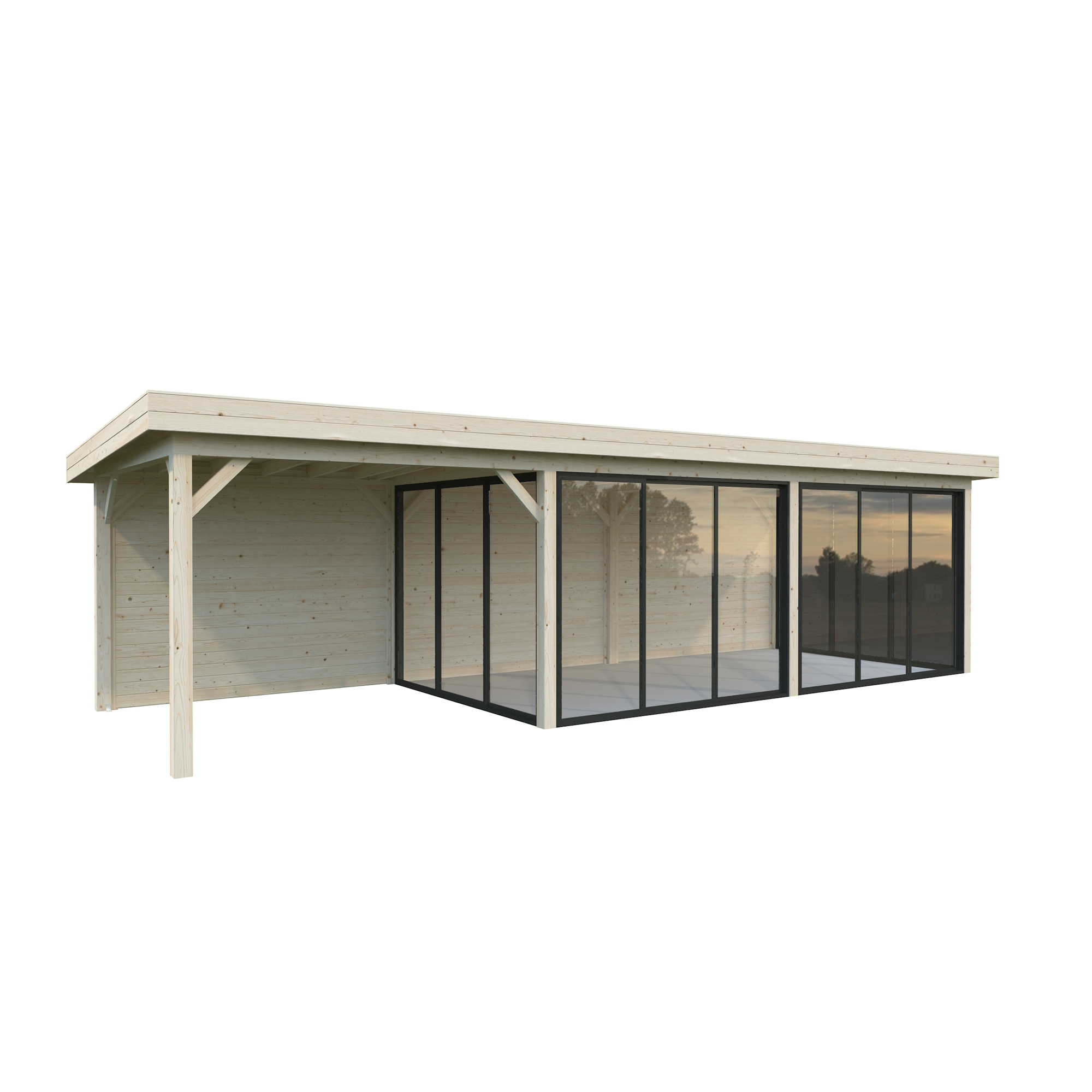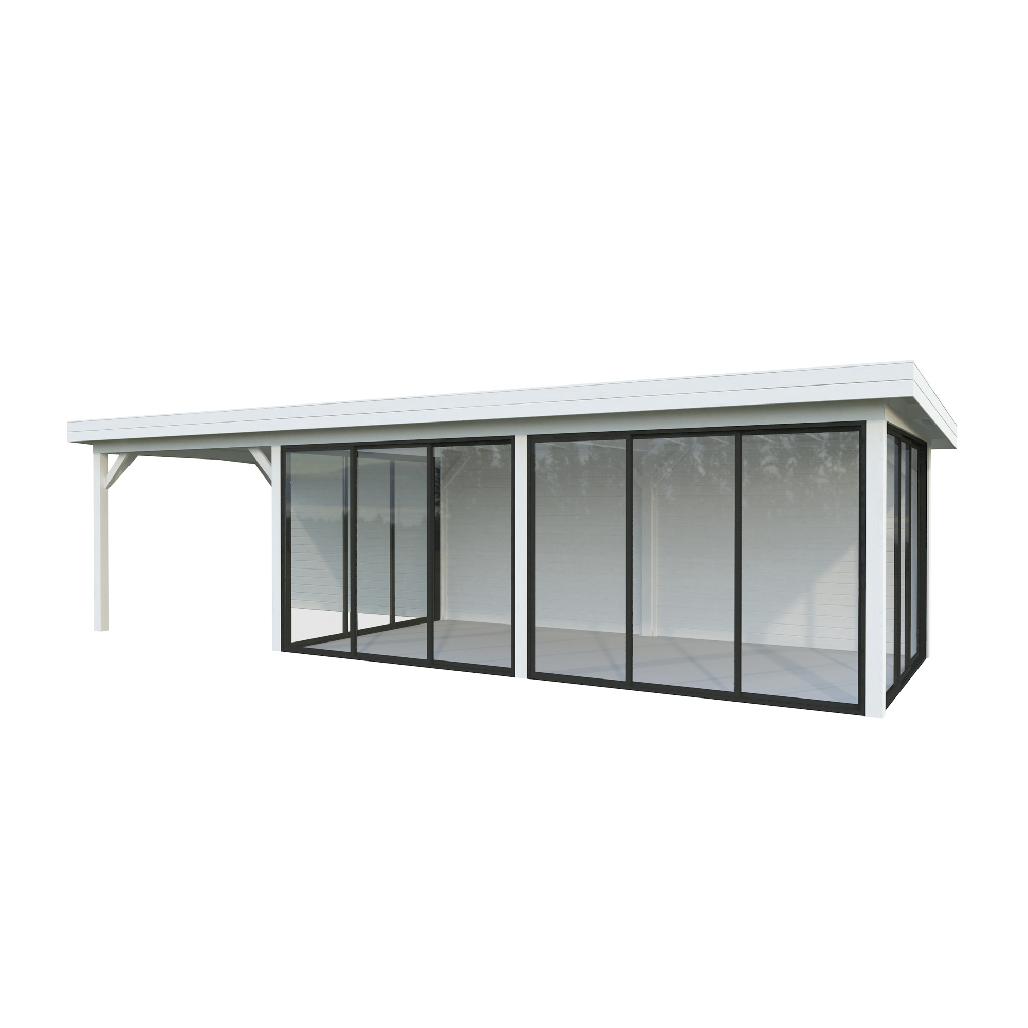 Tillverkad av nordisk gran med 120x120 mm starka limträstolpar och 19 mm takbrädor. Låsbara skjutdörrarna i 24 mm härdat dubbelglas (4 mm härdat glas - 16 mm luftspalt - 4 mm härdat glas) monterat i solida aluminiumprofiler. 28 mm väggstockar.