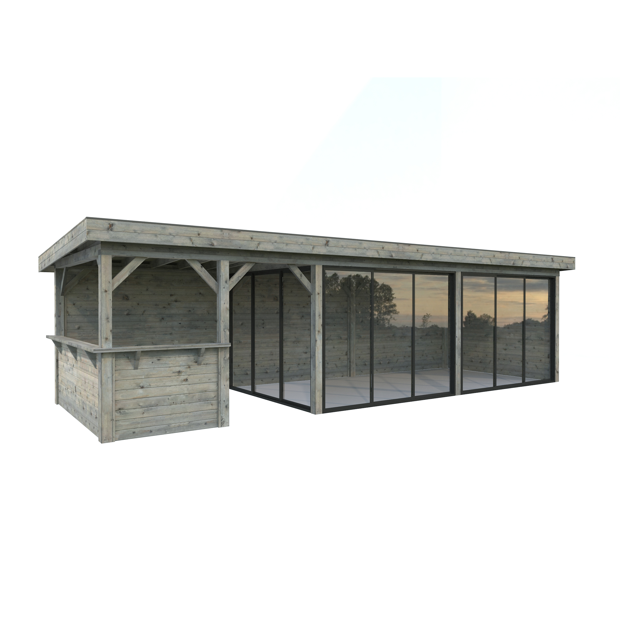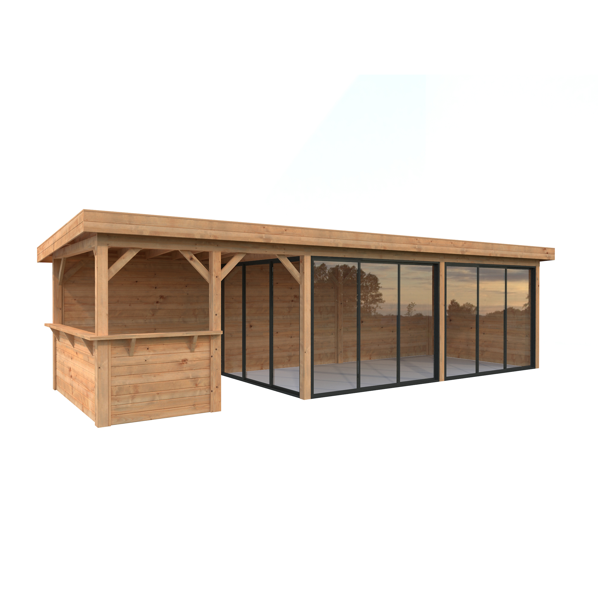 Tillverkad av nordisk gran med 120x120 mm starka limträstolpar och 19 mm takbrädor. Låsbara skjutdörrarna i 24 mm härdat dubbelglas (4 mm härdat glas - 16 mm luftspalt - 4 mm härdat glas) monterat i solida aluminiumprofiler. 28 mm väggstockar.