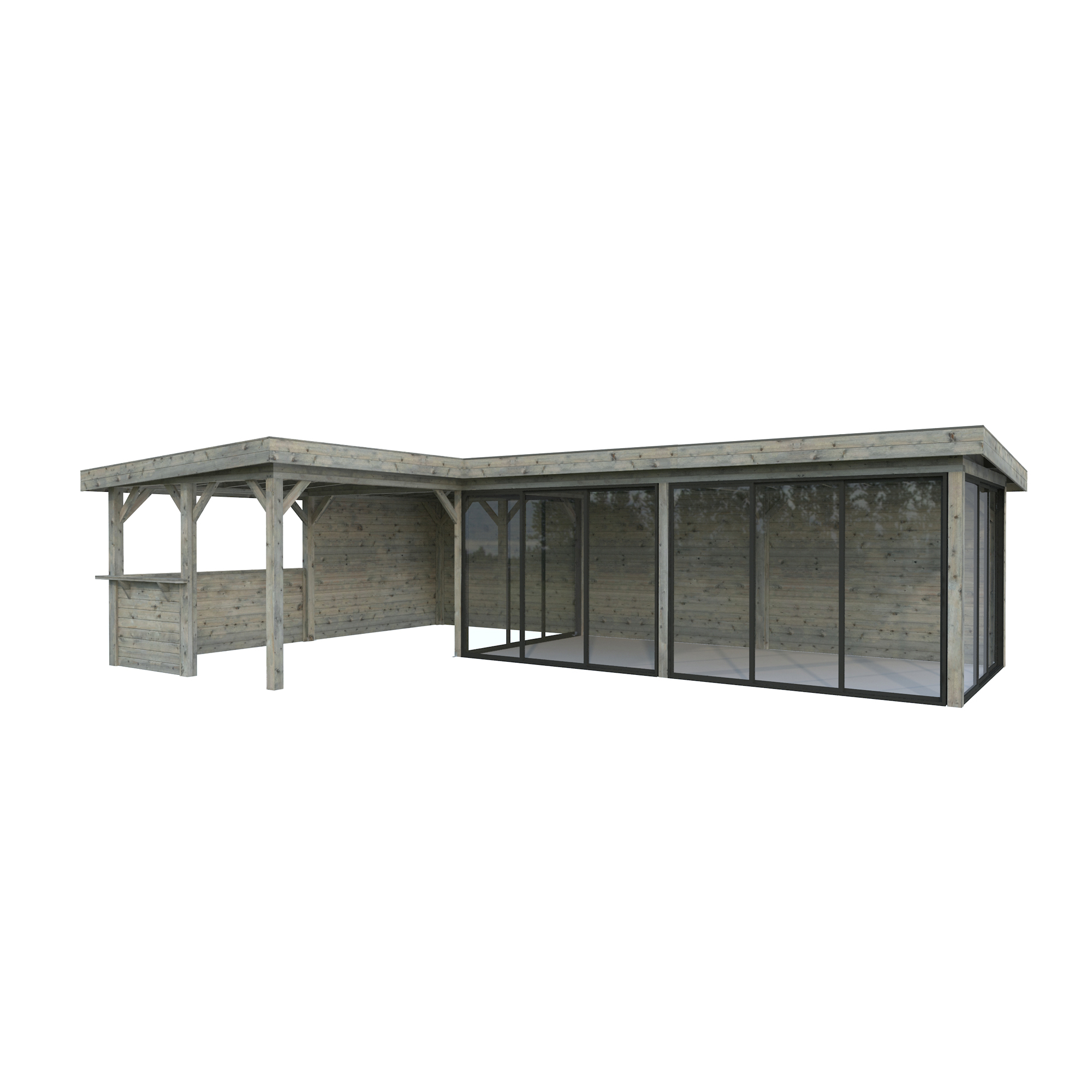 Tillverkad av nordisk gran med 120x120 mm starka limträstolpar och 19 mm takbrädor. Låsbara skjutdörrarna i 24 mm härdat dubbelglas (4 mm härdat glas - 16 mm luftspalt - 4 mm härdat glas) monterat i solida aluminiumprofiler. 28 mm väggstockar.