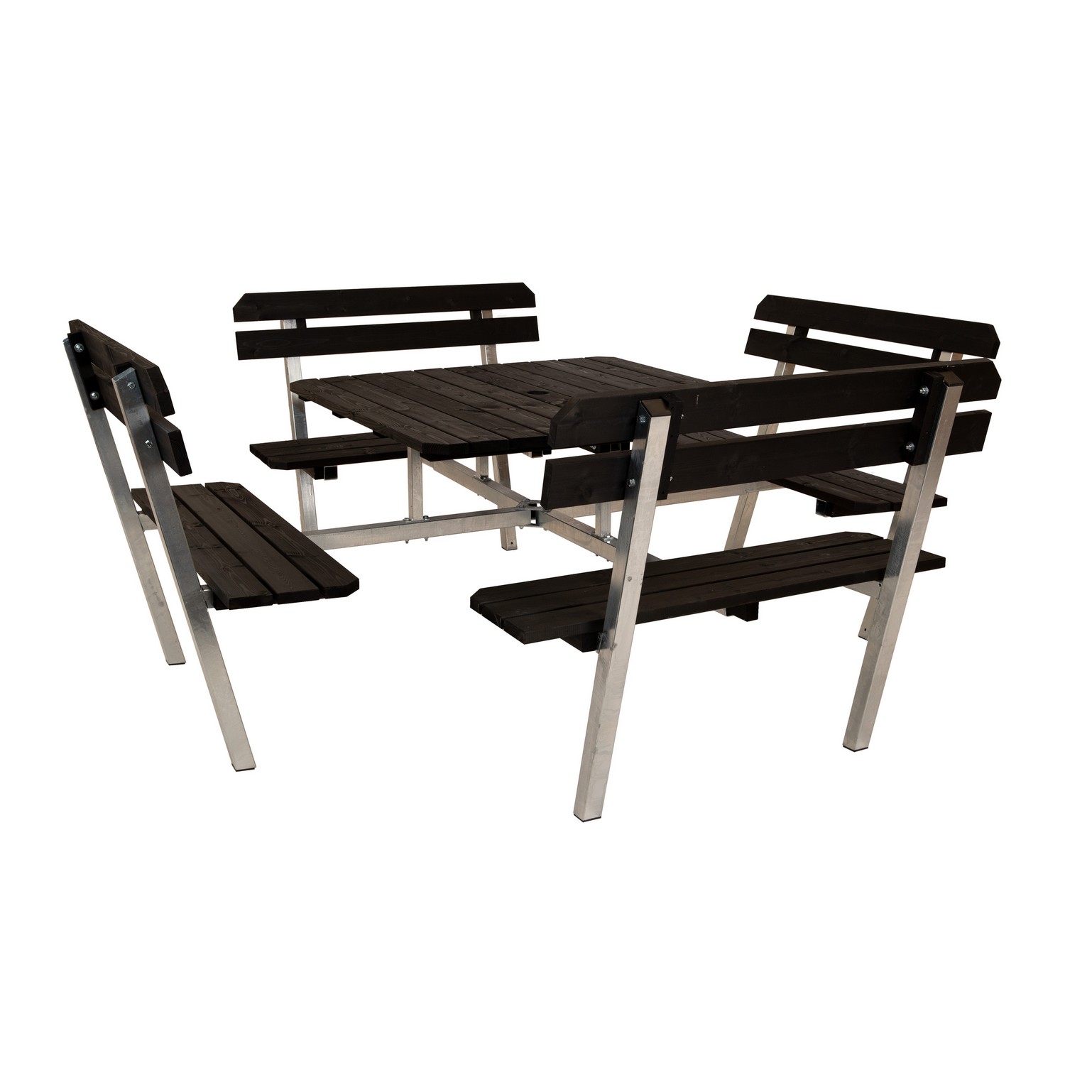 En kvadratisk sittgrupp från Eden Wood med gott om plats för 8 personer. Tillverkad i svenskt FSC-furu och Ø 50 mm varmgalvat stål. Levereras omonterad.