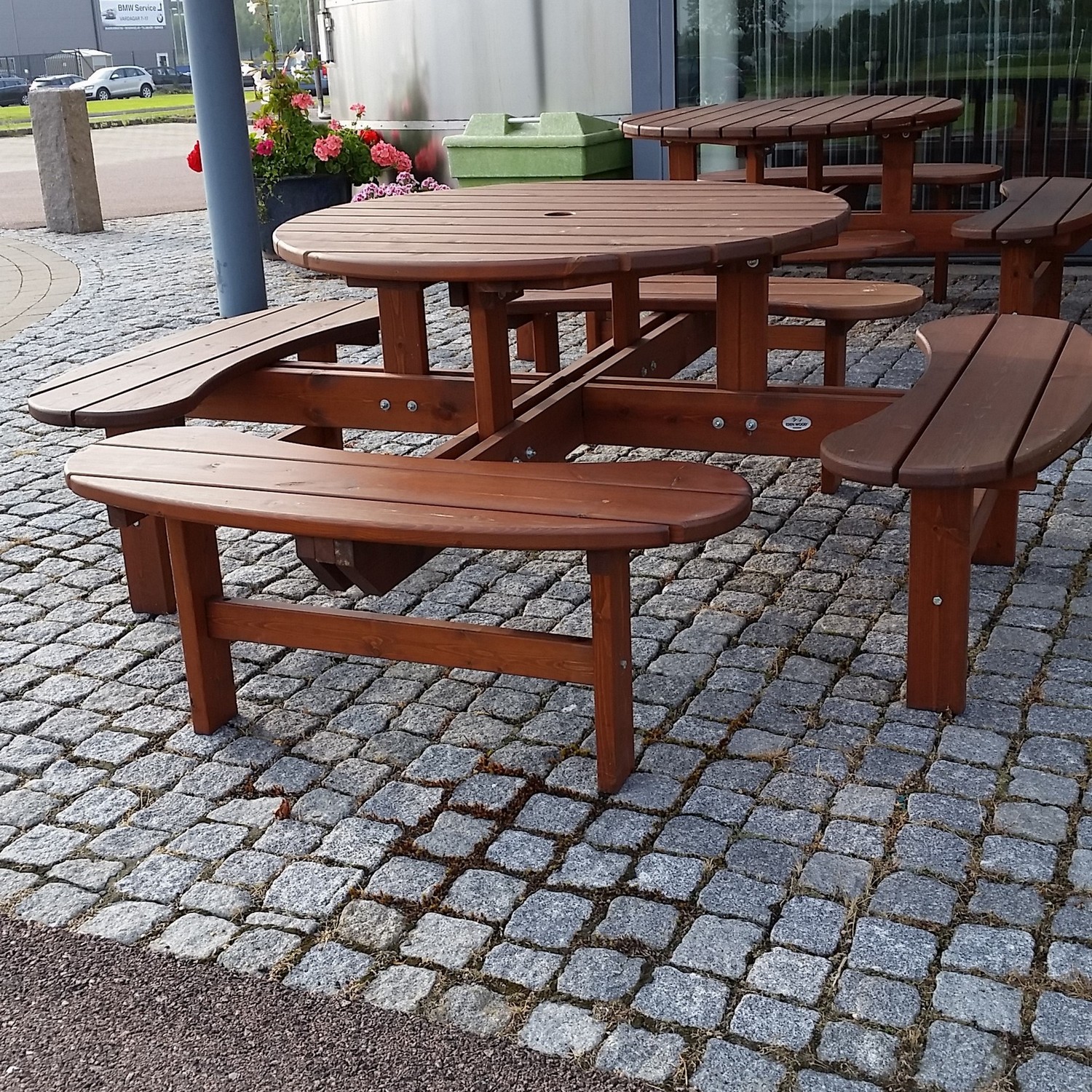 Ibland är det inte komforten som avgör utan platsen. Ett behändigt parkset med bänk och bord i ett, strategiskt placerat på din favoritplats, fulländar den enklaste picknicken. En trivsamt rund matplats för upp till 8 personer. Gruppen är tillverkad i svenskt FSC-furu. Levereras omonterad.
