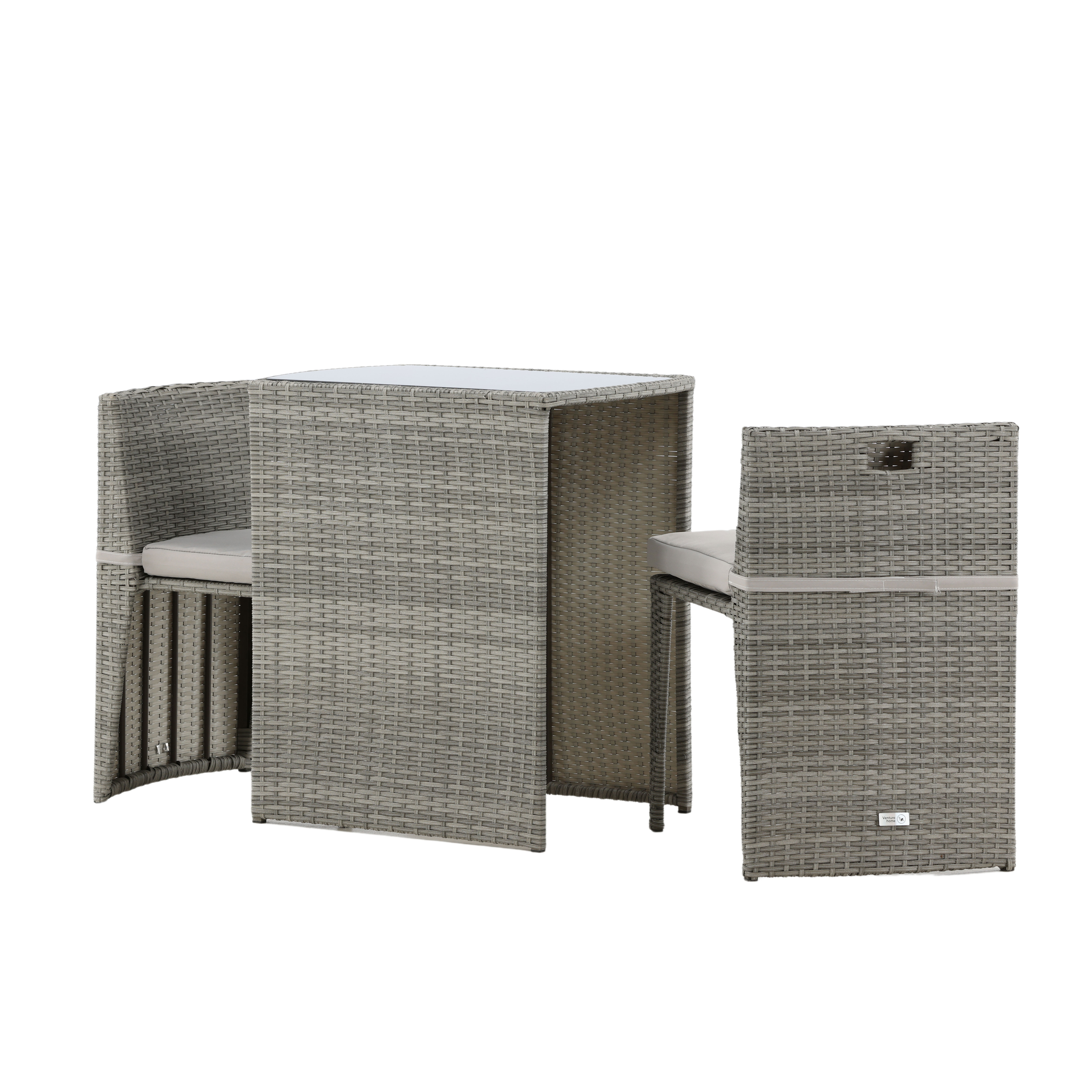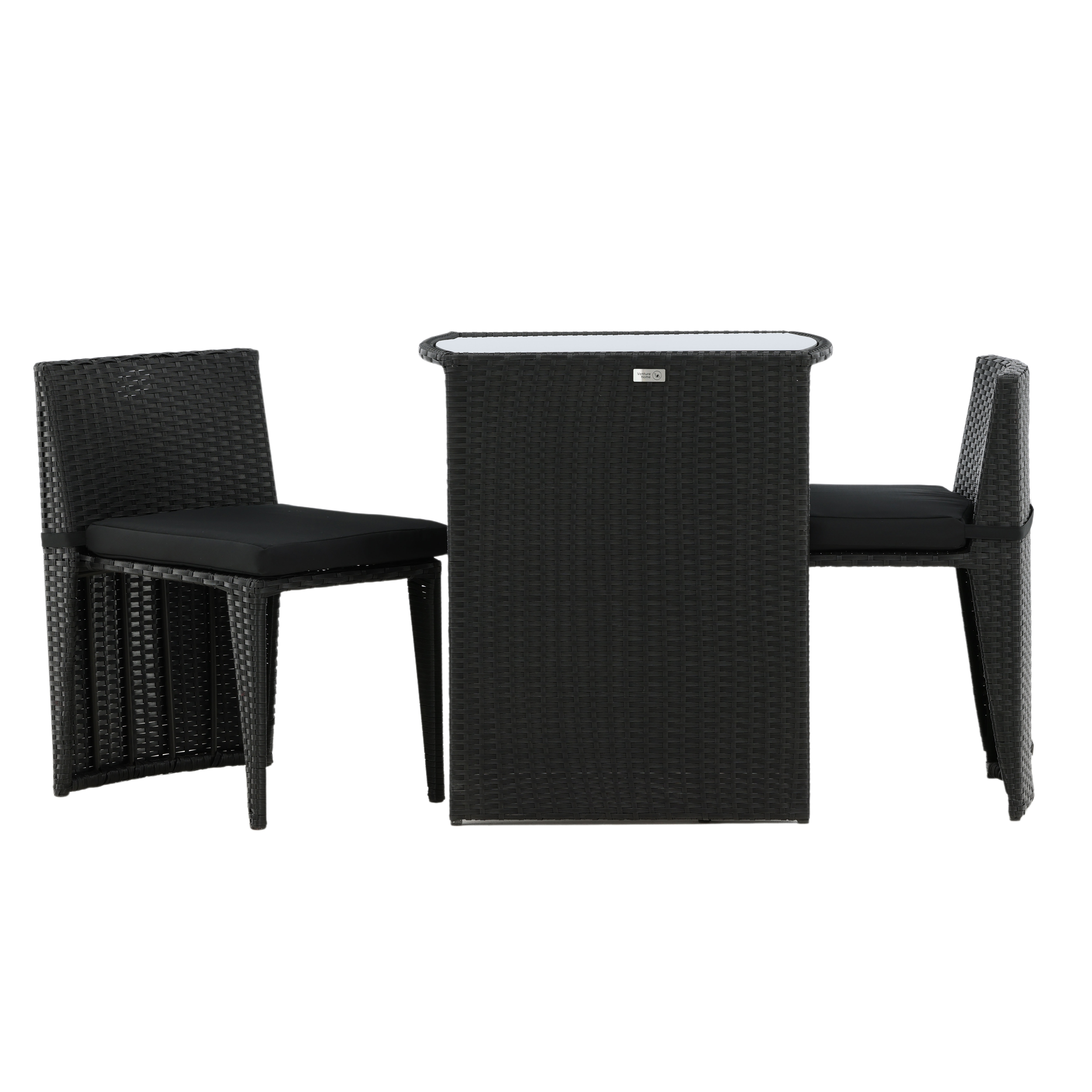 Cafésetet består av två stolar och ett bord med tillhörande glasskiva som står på pall för både väder och vind, de nätta stolarna kommer med mjuka sittdynor och du kan enkelt skjuta in stolarna under bordet för enkel förvaring och platsbesparing.