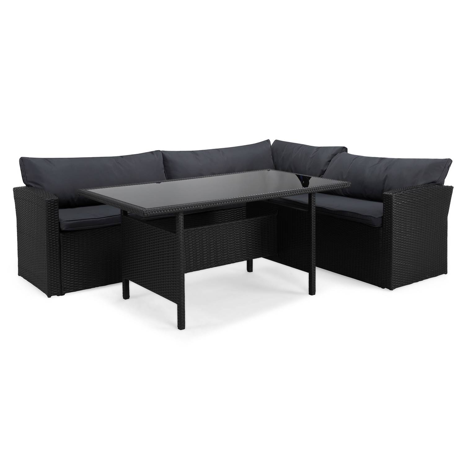 James Light är en prisvärd utemöbelgrupp med hörnsoffa och tillhörande bord. Här kan du samla hela familjen och njuta av somriga måltider. Möbelgruppen är tillverkad av konstrotting, ett slitstarkt material som lämpar sig bra för utomhusbruk. Bordet har en toppskiva av härdat glas och vackert format underrede med smart förvaringshylla. Dynor ingår.