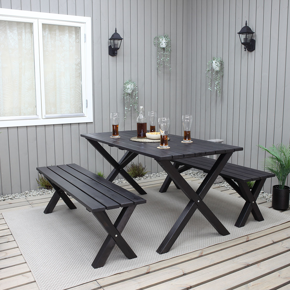 Matgrupp med snyggt designade ben. Matgruppen består av ett matbord och 2 bänkar. En klassisk rustik och samtidigt modern möbelgrupp som gör sig bra samtidigt på gräsmark och uteplats.