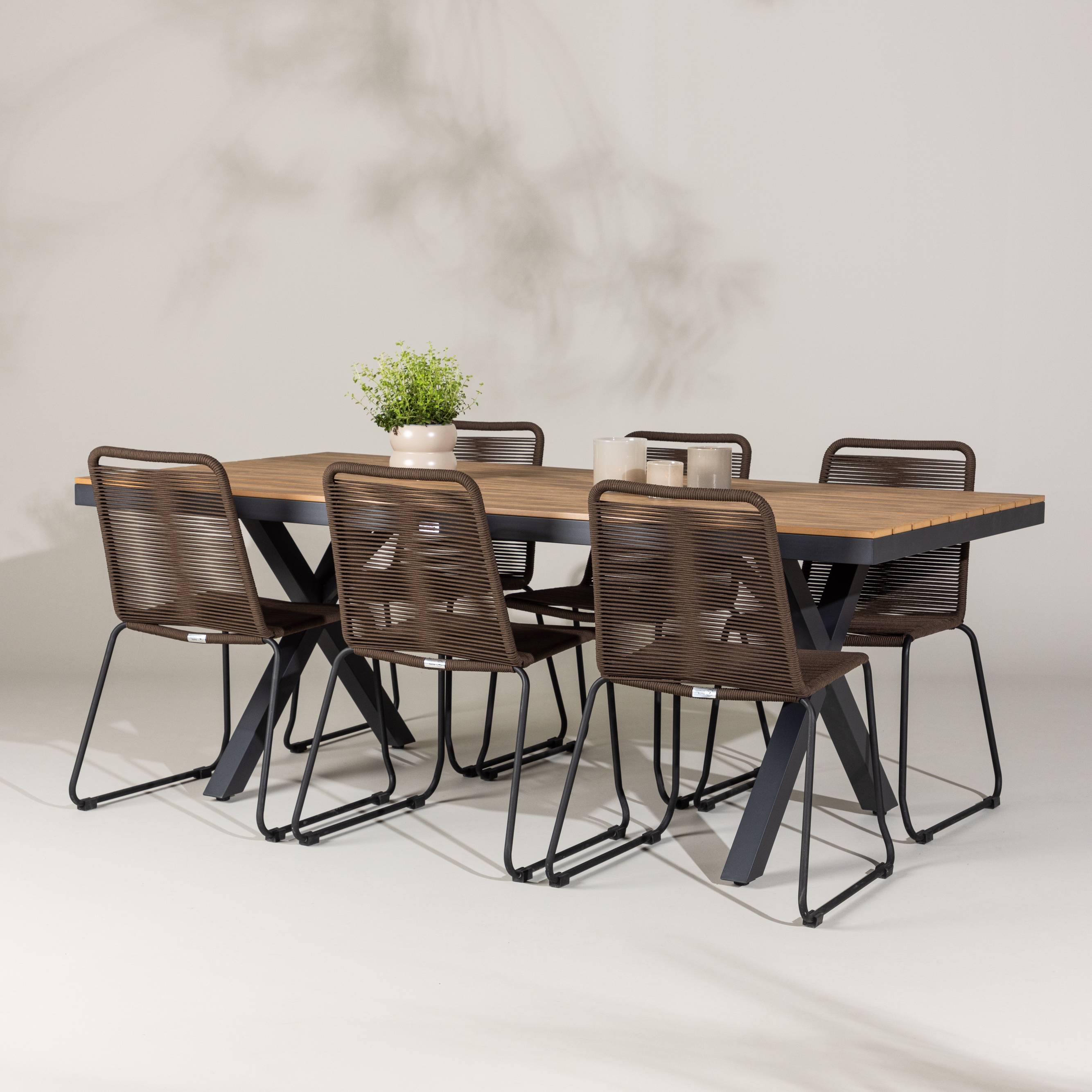 Stolarna Lindos är det ultimata komplementet till Garcia-bordet. Tillverkade med rep och stålben i en elegant svart färg, erbjuder dessa stolar både stil och komfort för din utomhusavkoppling. Med sex inkluderade stolar är denna matgrupp perfekt för att samla familj och vänner för minnesvärda stunder under öppen himmel.