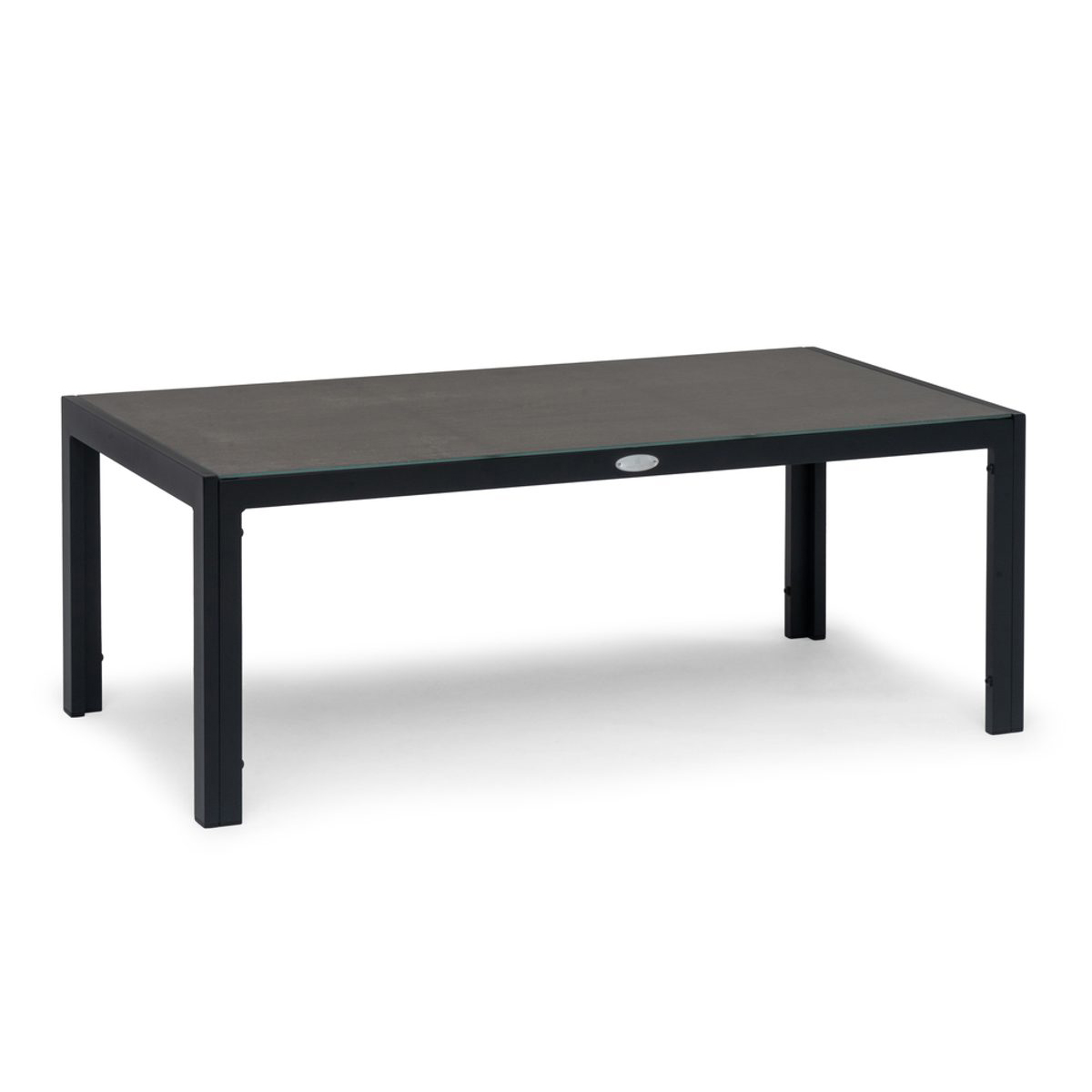 Stilrent och underhållsfritt loungebord tillverkad i aluminium med bordsskiva i varmgrå melerad keramisk glas, 5 mm tjock.