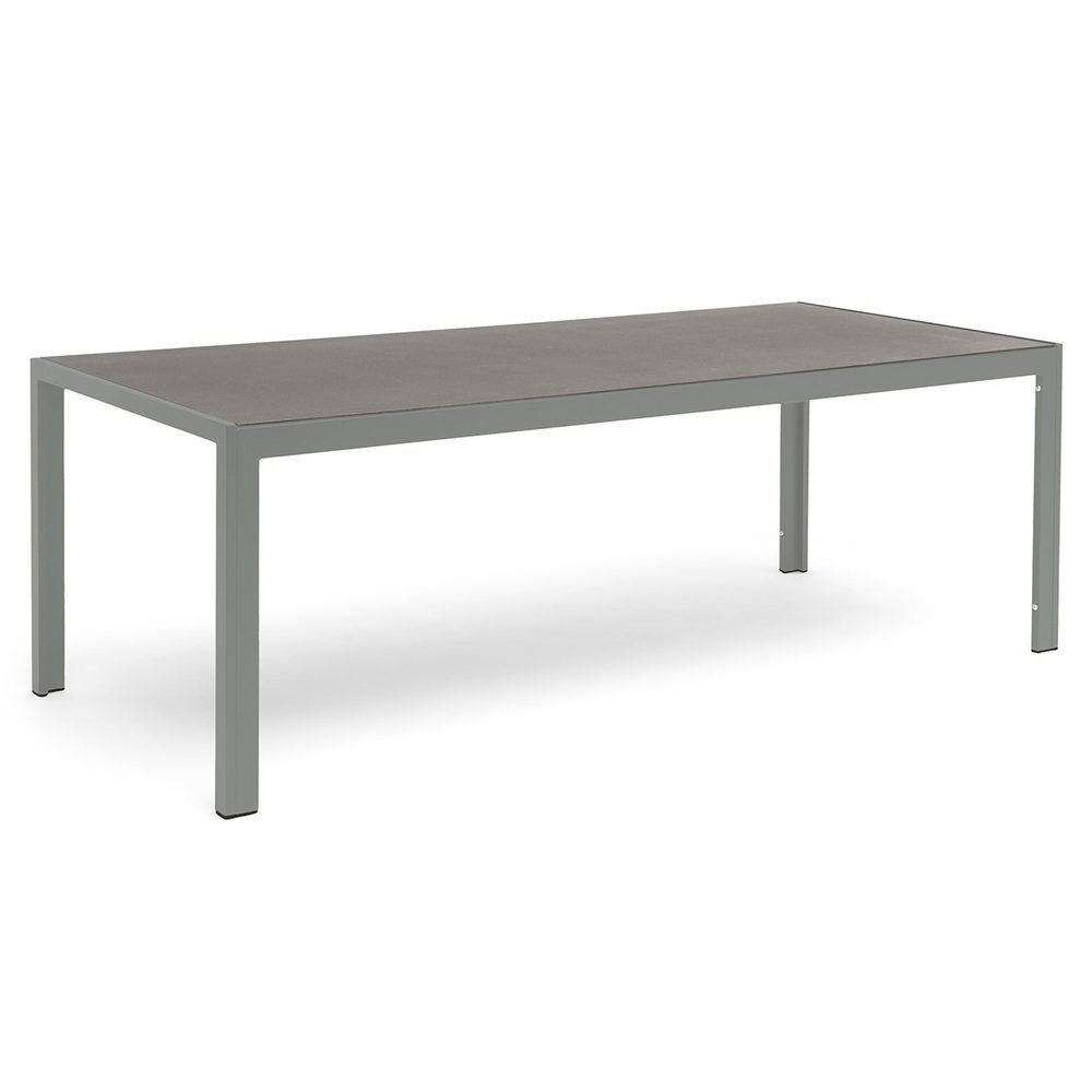 Stilrent och underhållsfritt allroundbord som passar till många olika stolar. Tillverkad i aluminium. Bordsskiva i varmgrå melerad keramisk glas, 8 mm tjock.