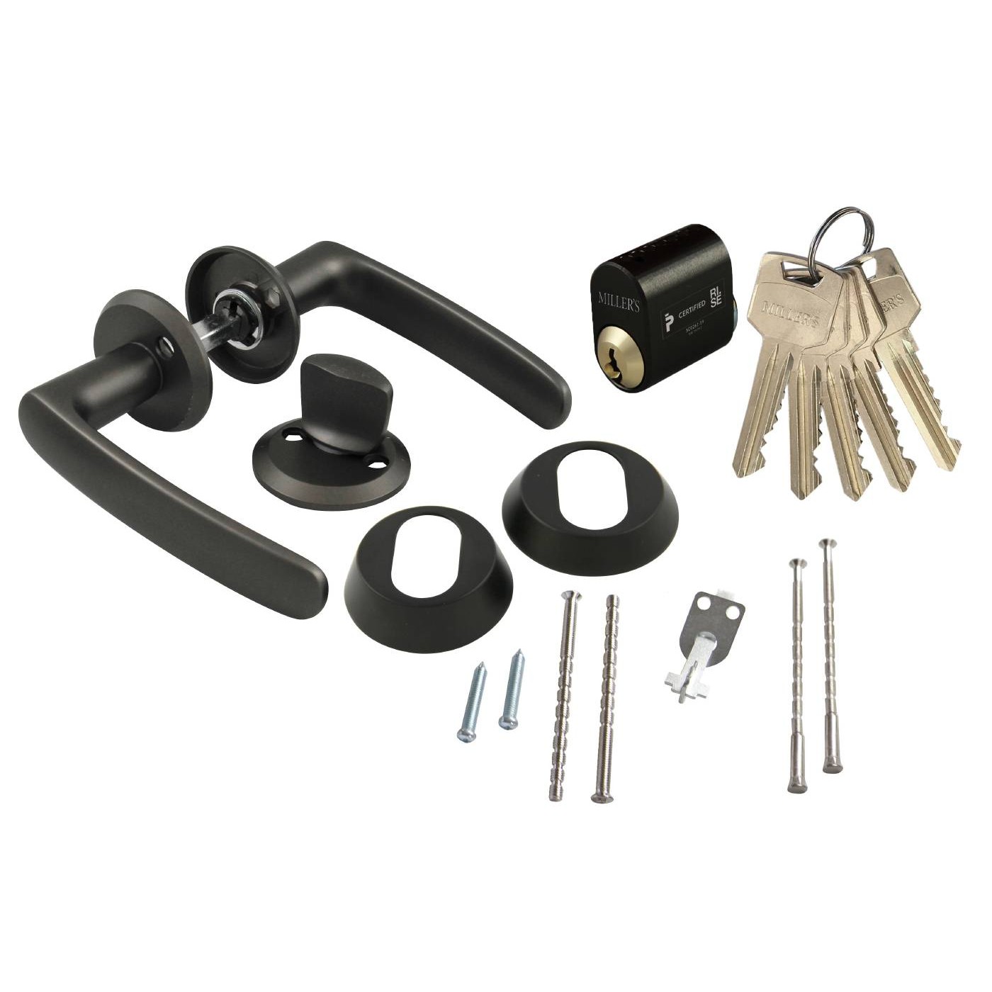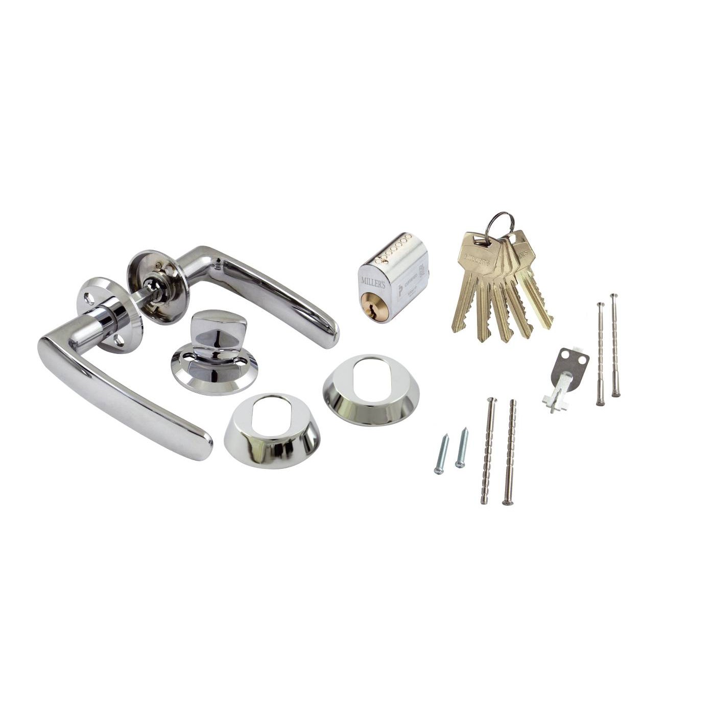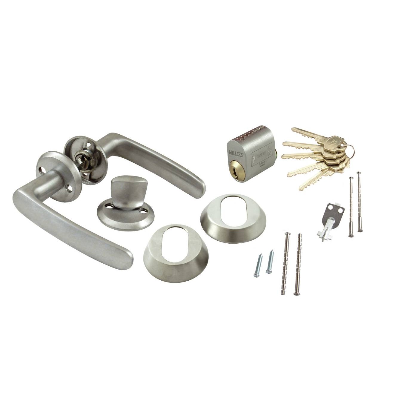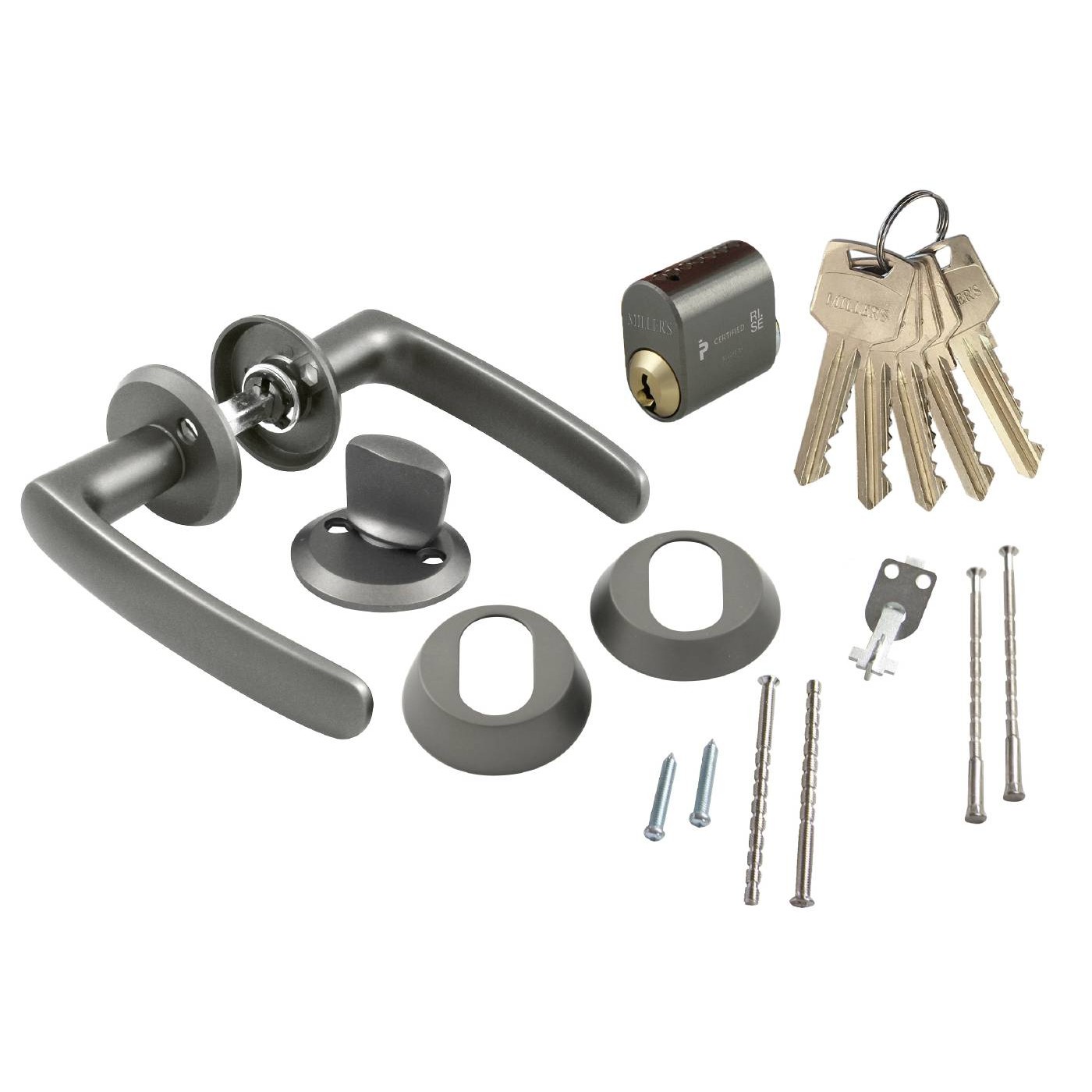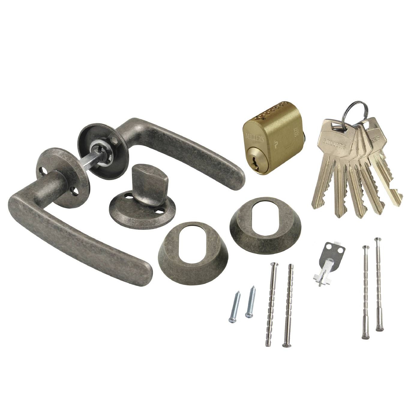 Behörssats. Innehåller: 1 par dörrhandtag, 1 oval låscylinder som uppfyller kraven för SP klass 3; 5 nycklar, 1 cylindervredsats, 2 cylinderringar (11 och 16 mm), 2 roddarpinnar (100 och 120 mm) samt skruvar. För dörrtjocklek 38-70 mm.
