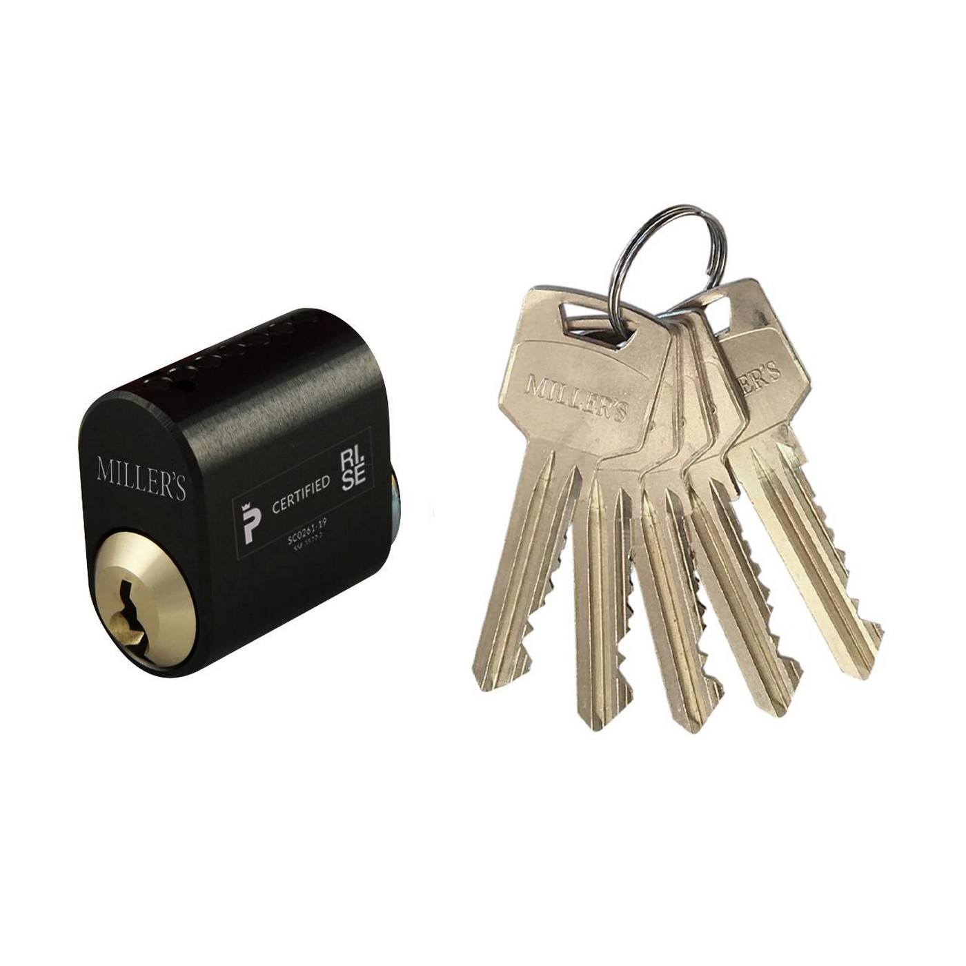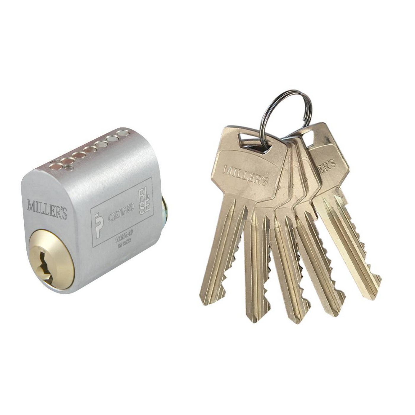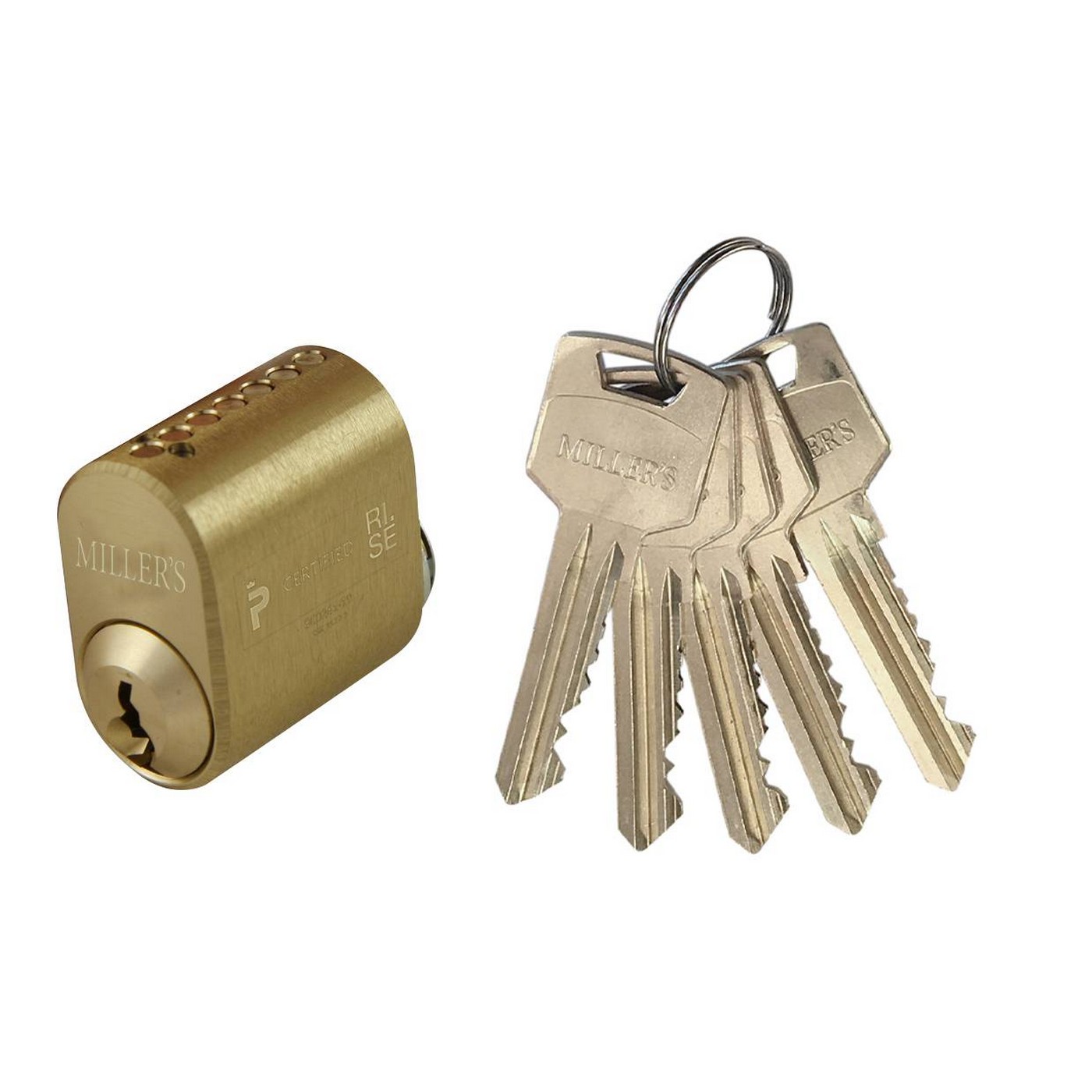 Oval låscylinder i mässing. Levereras med 5st nycklar. 7-stift. För genomgående fastsättning. Uppfyller kraven för klass 3.