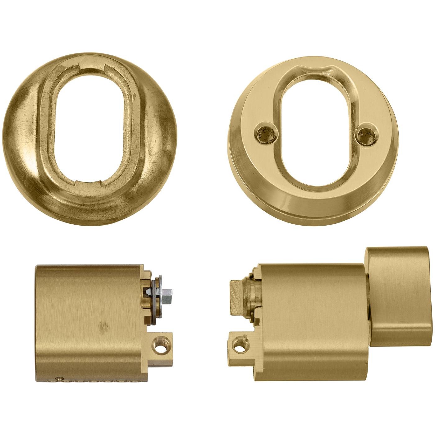 Cylinderset med ovalcylinder utsida och vredcylinder insida för genomgående fastsättning. Levereras med cylindrar, universal cylinderringar, skruv och förläningsdel 12,5mm. Används där inte speciella säkerhetskrav ställs.