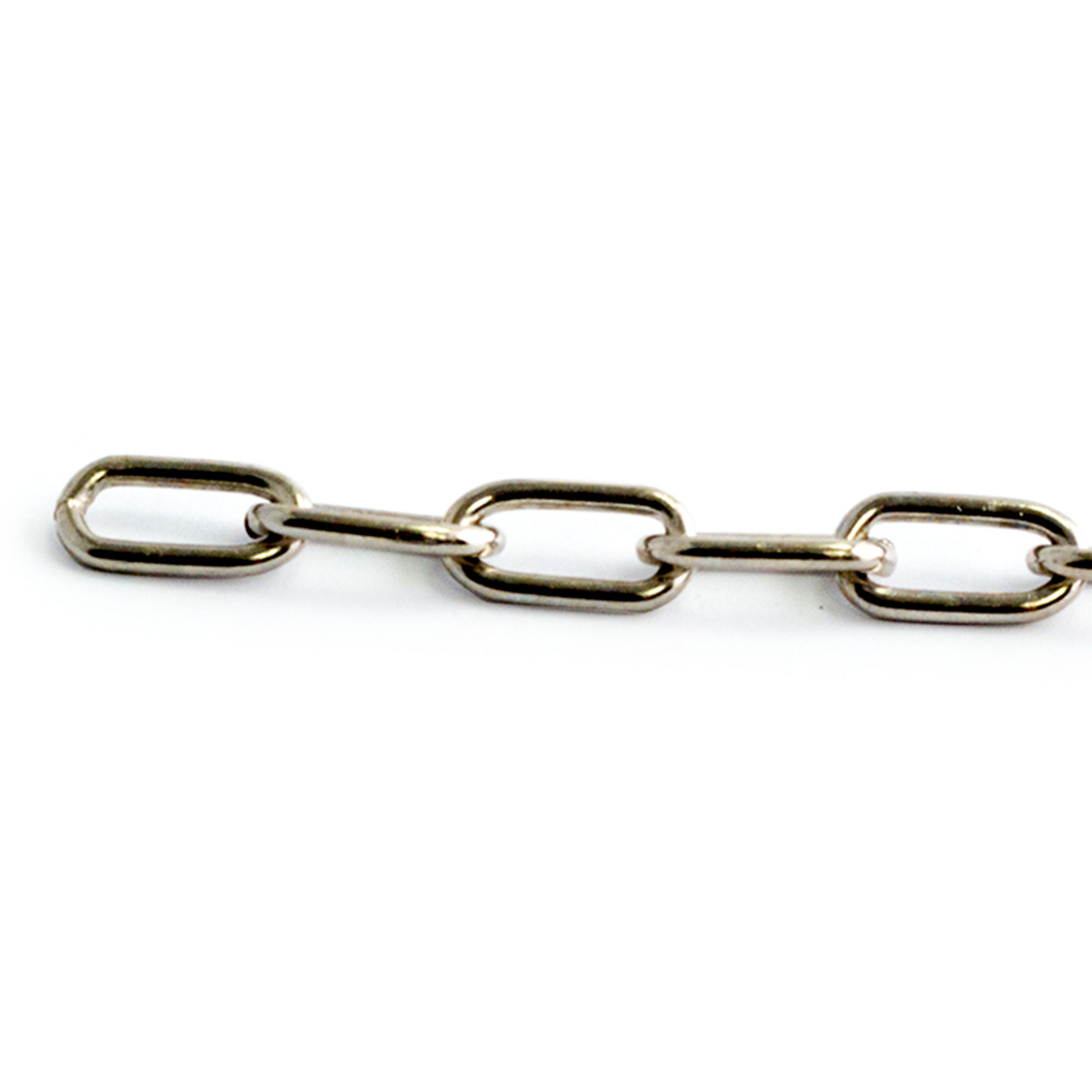 Ovallänkad dekorkätting av stål. Maxbelastning 12 kg. Detta är den belastning vi säkert vet att produkten tål. Brottgränsen, när materialet brister, är för vår kätting 5 gånger angiven maxbelastning. (Värdena är beräknade och garanteras inte)