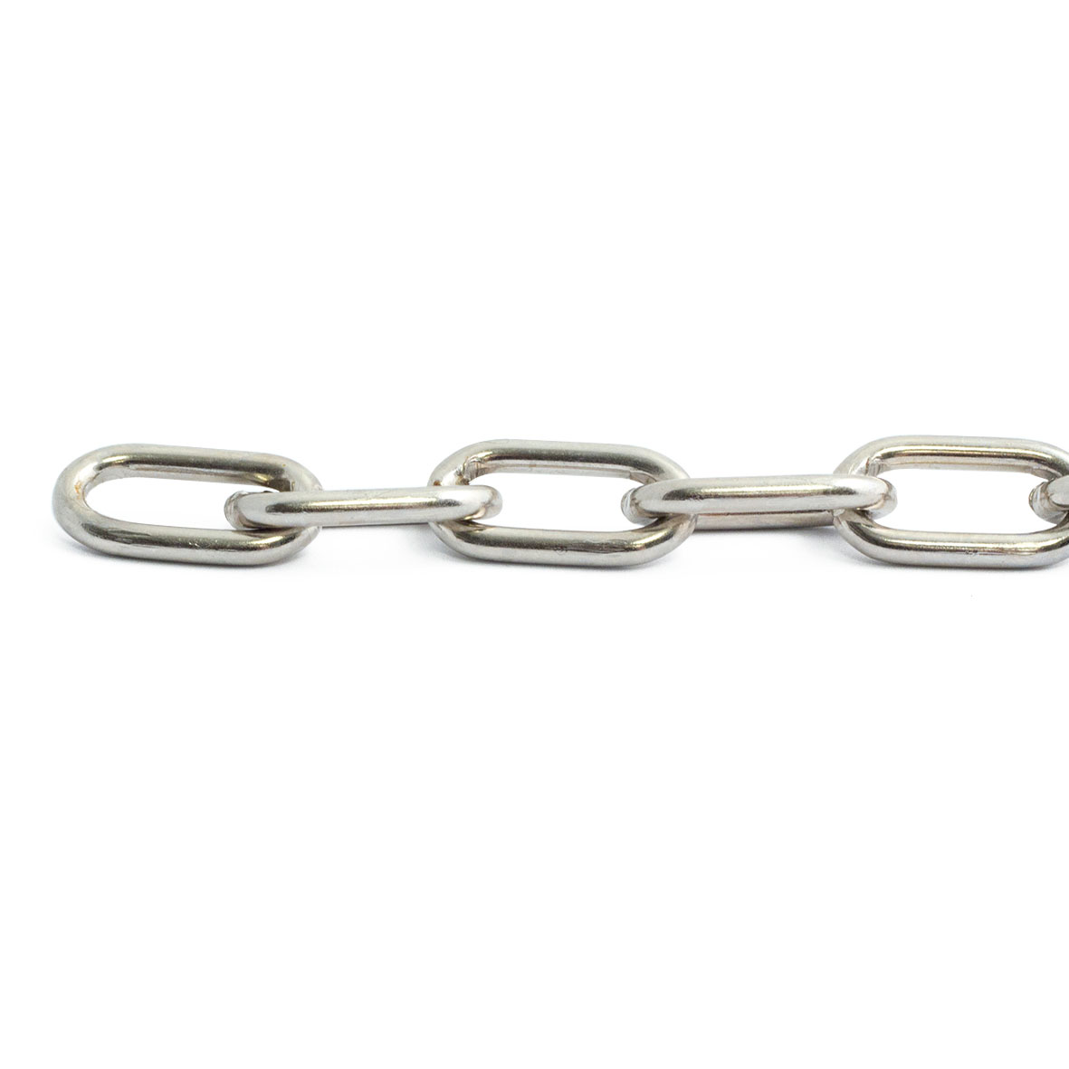 Ovallänkad dekorkätting av stål. Maxbelastning 15 kg. Detta är den belastning vi säkert vet att produkten tål. Brottgränsen, när materialet brister, är för vår kätting 5 gånger angiven maxbelastning. (Värdena är beräknade och garanteras inte)