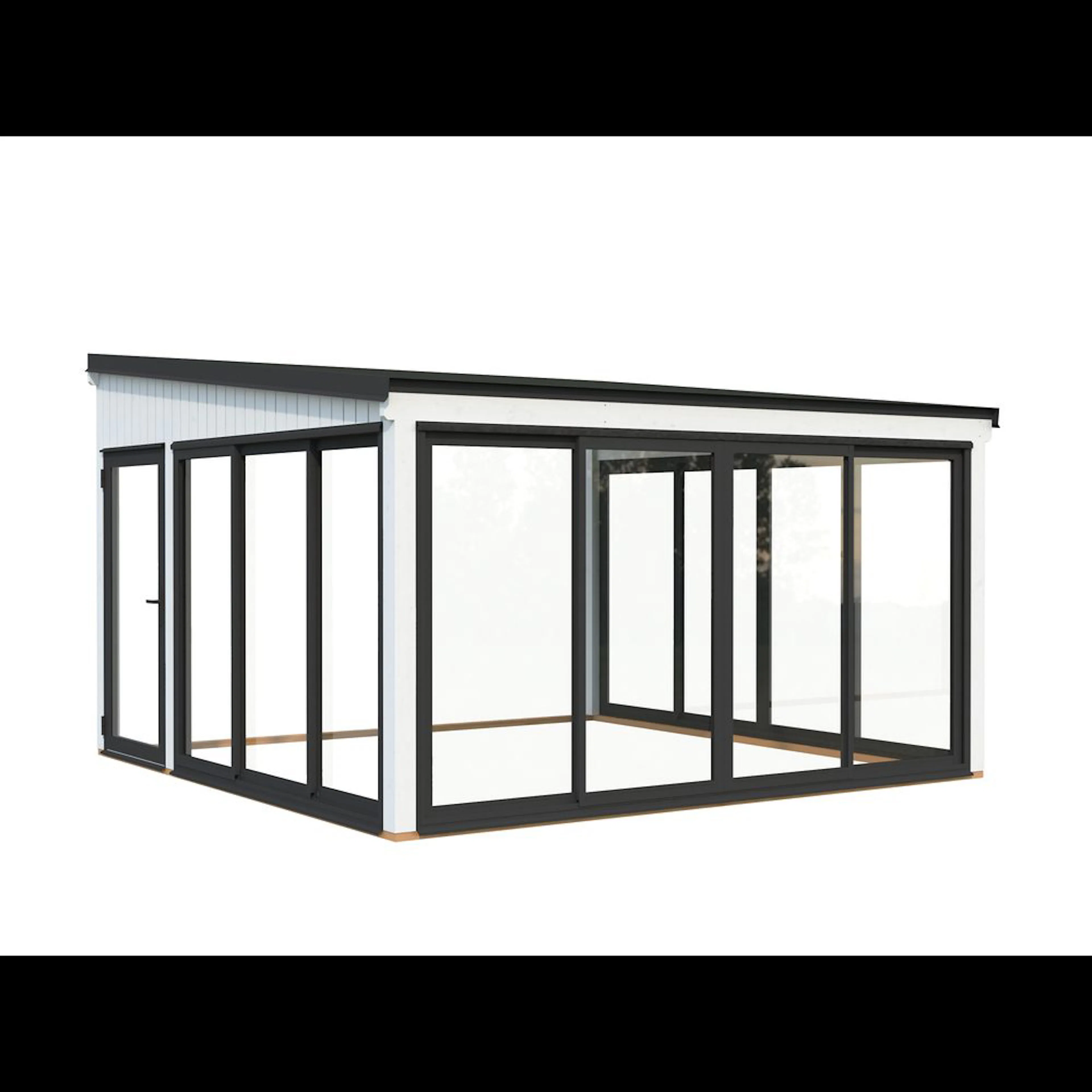 Med en yta på 16,6 m² erbjuder Lumi Slide Plus gott om utrymme för underhållning, avkoppling eller arbete hemifrån. Dörrarnas placering kan flyttas mellan sidoväggarna, vilket gör det enkelt att anpassa layouten efter din trädgård och dina behov.