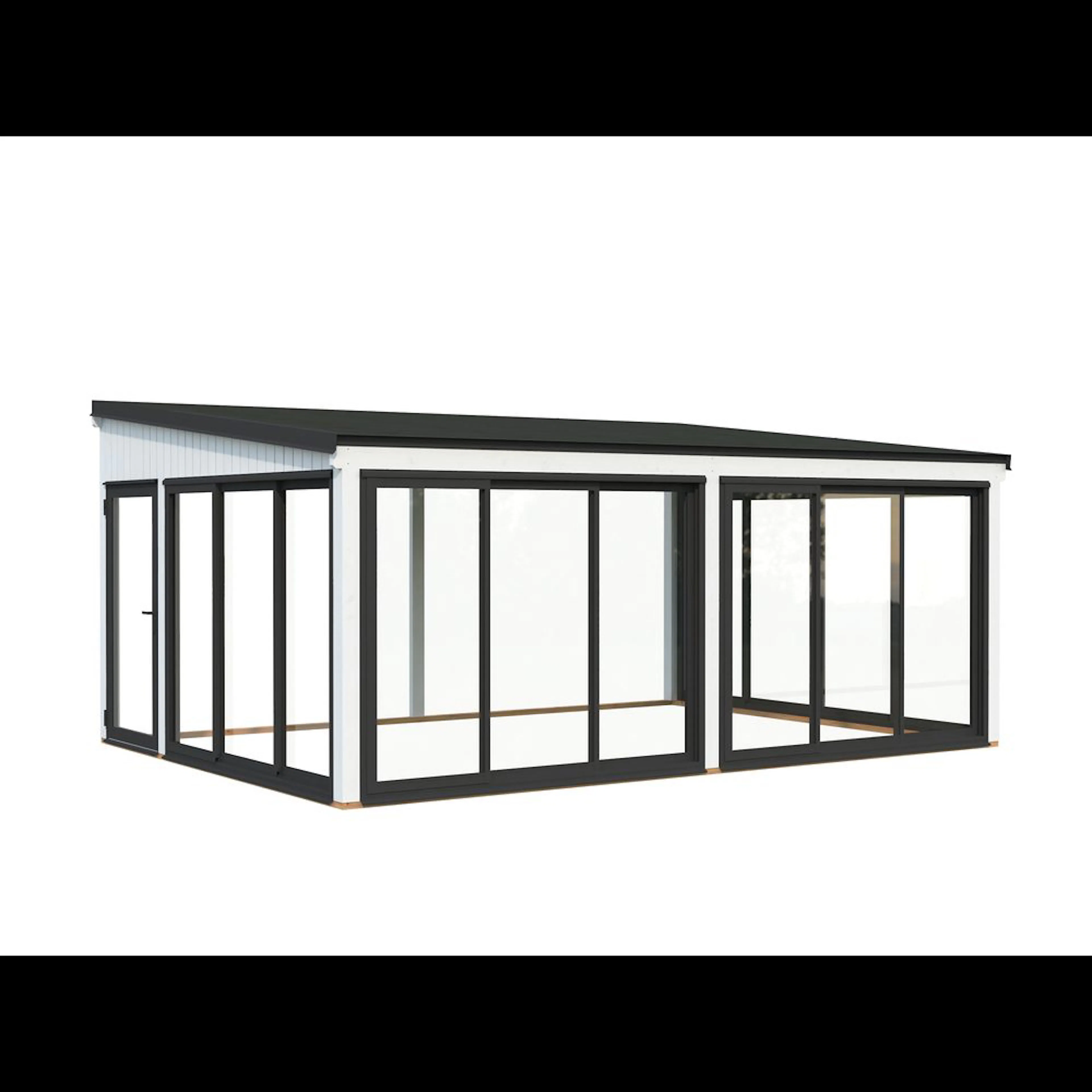 Med en yta på 23,3 m² erbjuder Lumi Slide Plus gott om utrymme för underhållning, avkoppling eller arbete hemifrån. Dörrarnas placering kan flyttas mellan sidoväggarna, vilket gör det enkelt att anpassa layouten efter trädgårdens förutsättningar och dina behov.