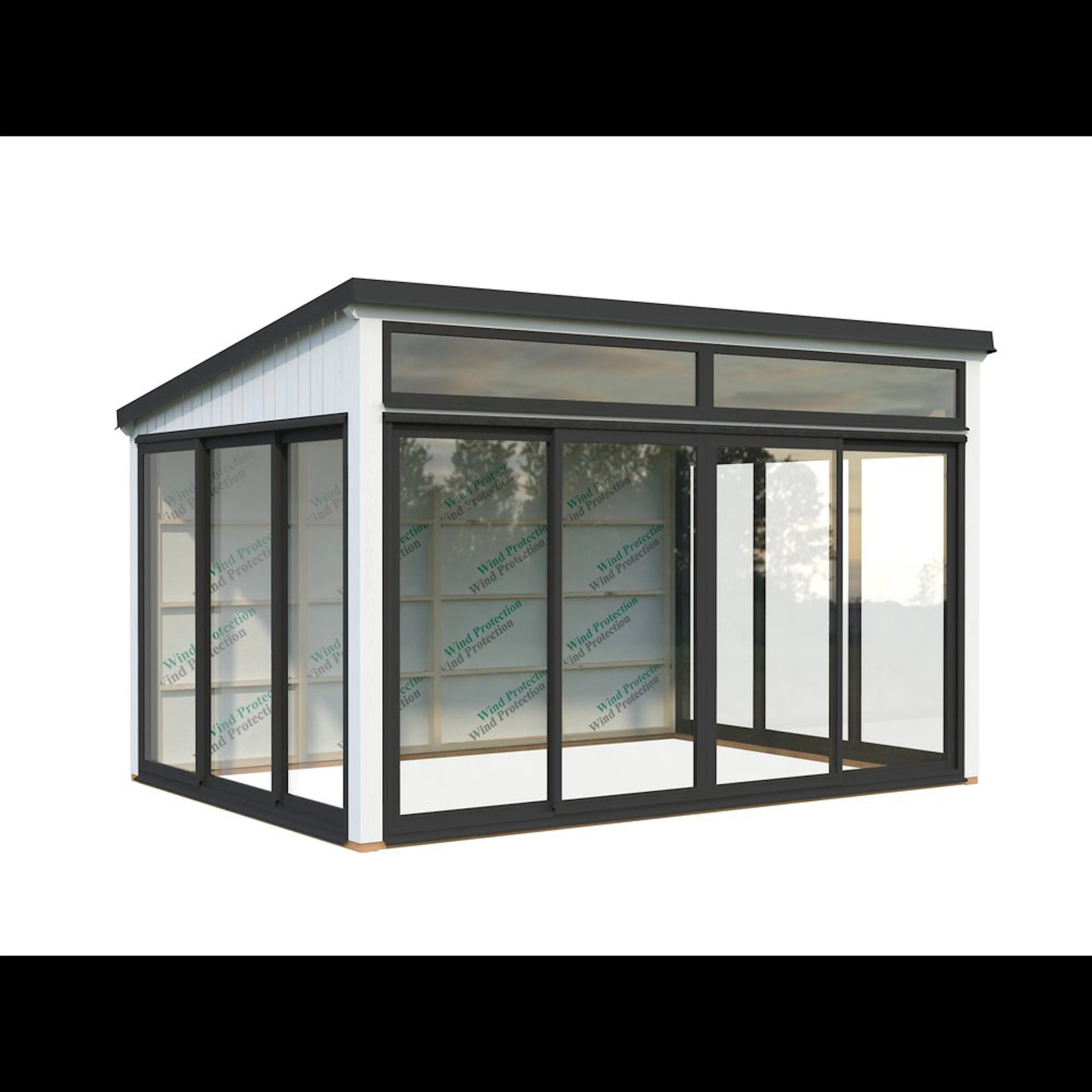 Elegant fristående uterum i nordisk stil med trästomme och aluminiumskjutdörrar. Saga 11,6 m² Slide är ett modernt, mångsidigt uterum tillverkat av högkvalitativ nordisk gran och stöds av laminerade stolpar (120x120 mm) för långvarig hållbarhet. Den rena, platta takdesignen och minimalistiska stilen gör det till ett elegant tillskott i moderna trädgårdar, på terrasser eller vid poolen.Paviljongen har aluminiumskjutdörrar med 4 mm härdat glas, vilket ger både säkerhet och stil. Skjutdörrarna är låsbara.