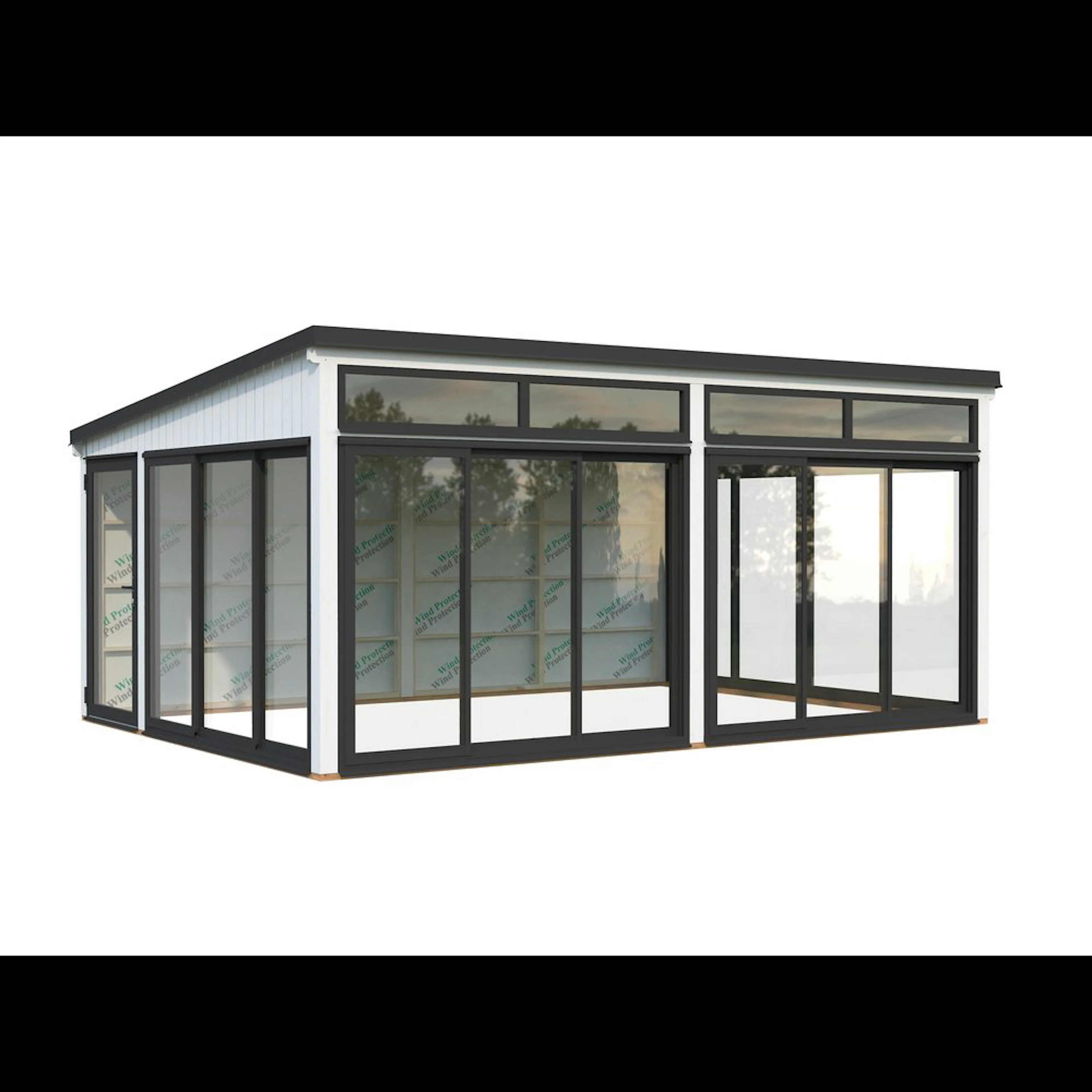 Elegant fristående uterum i nordisk stil i trä med dubbelglasade skjutdörrar i aluminium. Saga 23,3 m² Slide Plus är ett modernt och mångsidigt uterum byggt av högkvalitativ nordisk gran, med laminerade stolpar (120x120 mm) för långvarig stabilitet. Den rena, platta takdesignen och minimalistiska estetiken gör det till ett elegant tillskott för moderna trädgårdar, terrasser eller poolområden.Paviljongen har aluminiumskjutdörrar och en enkel aluminiumramad dörr, båda med 24 mm härdat dubbelglas, vilket ger hög säkerhet och tyst inomhusmiljö. Skjutdörrarna är låsbara.